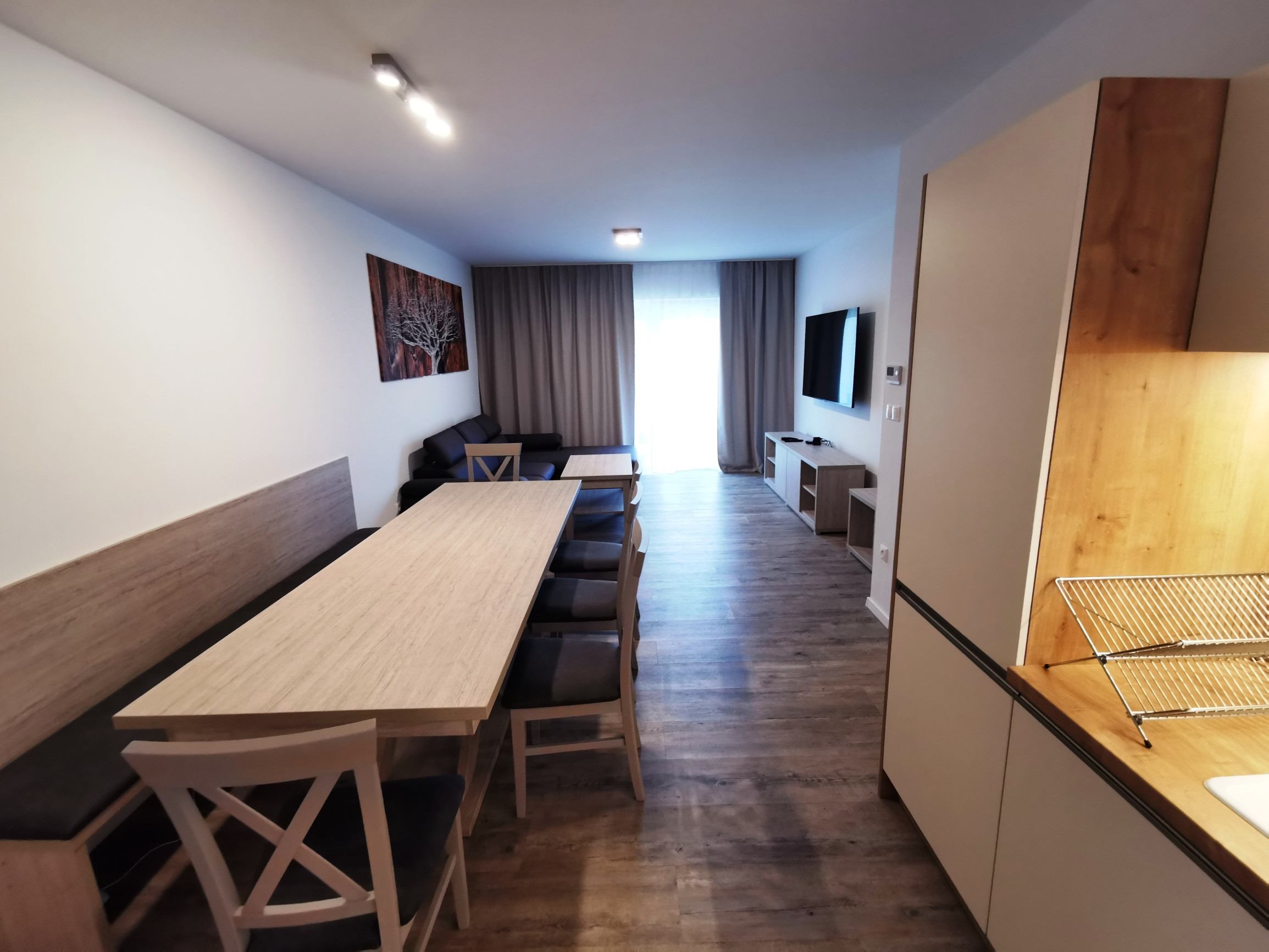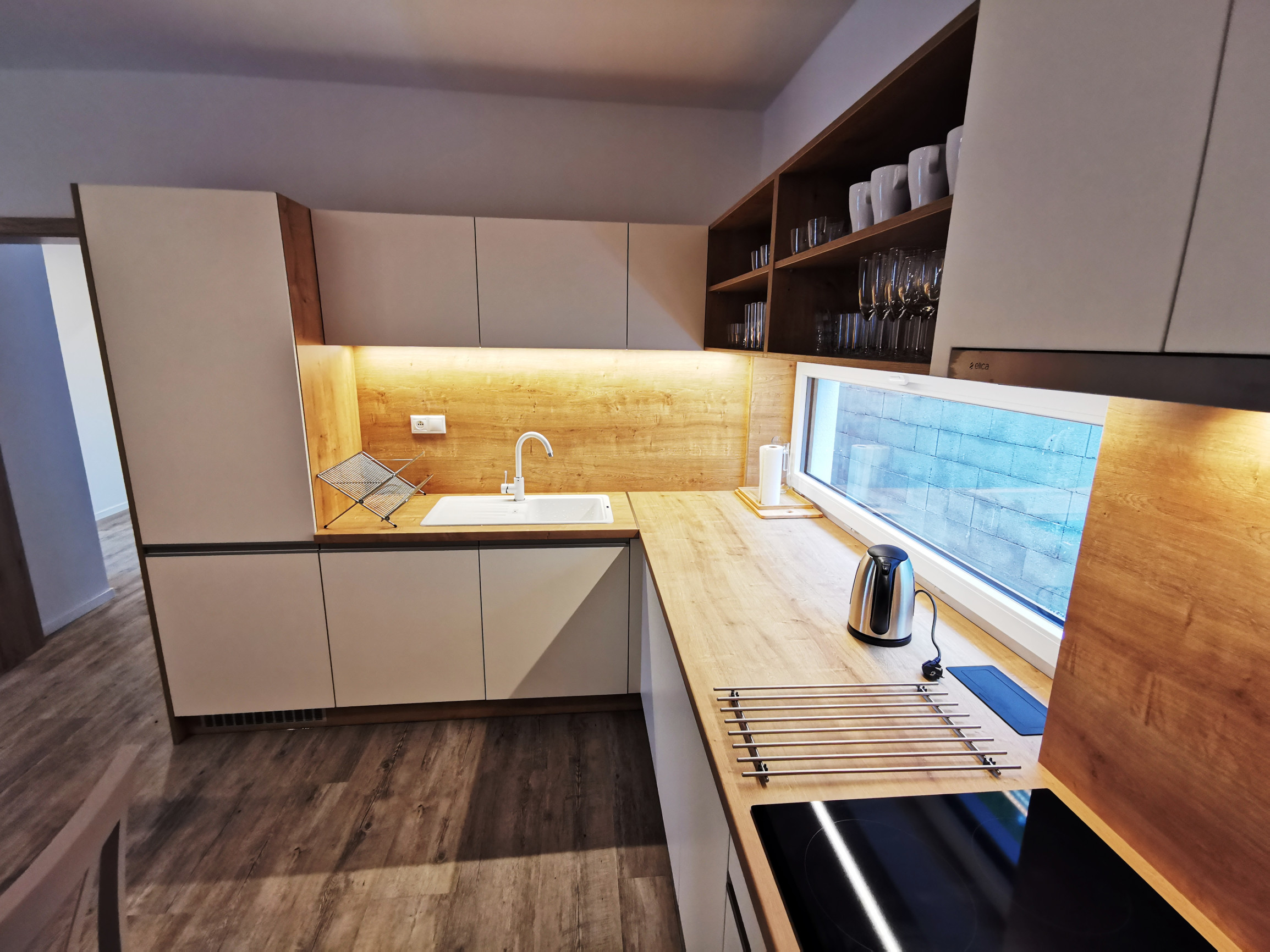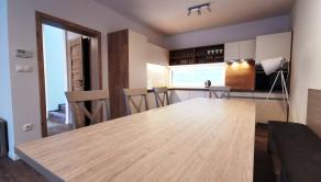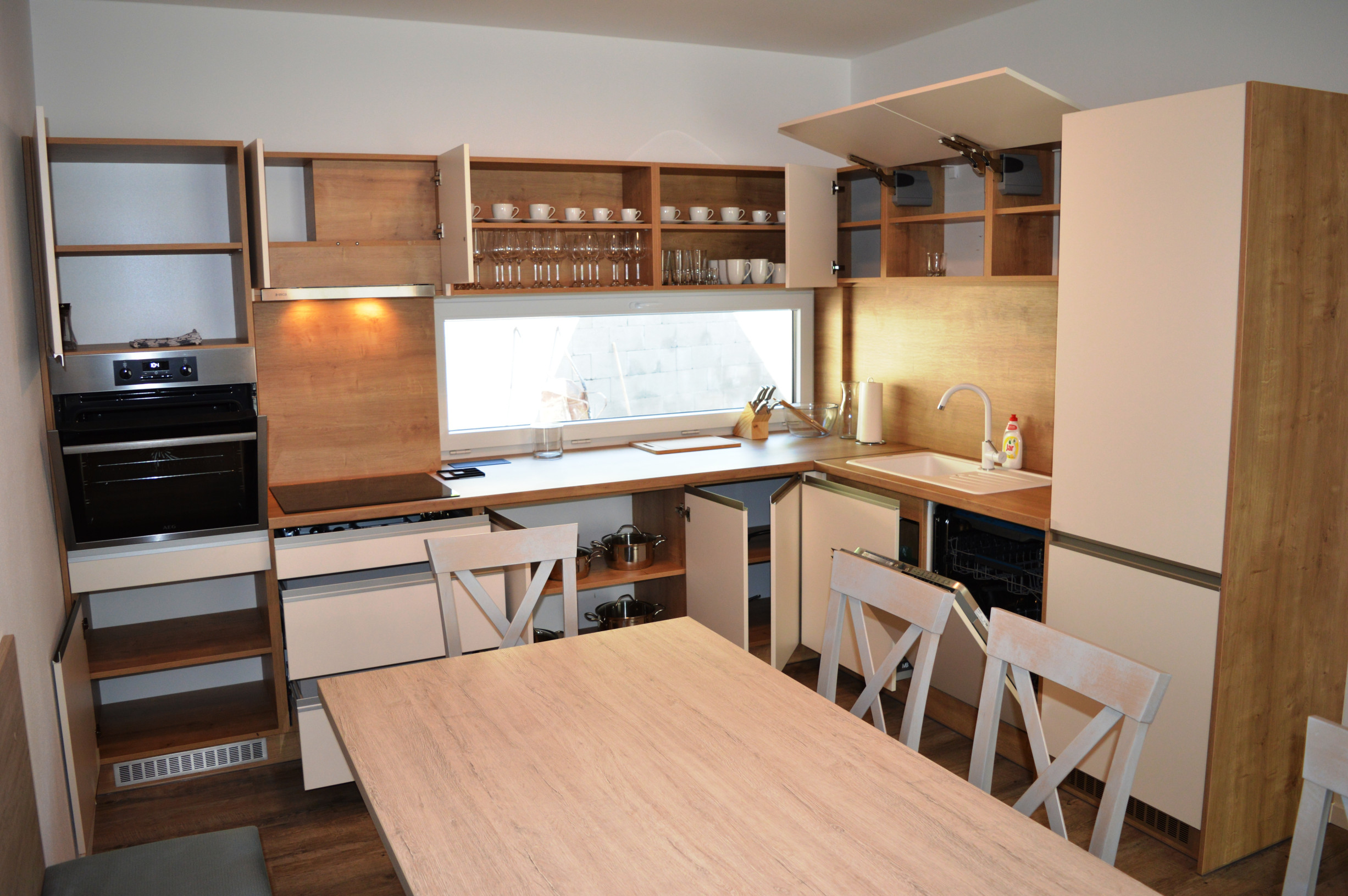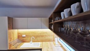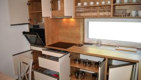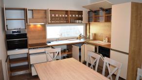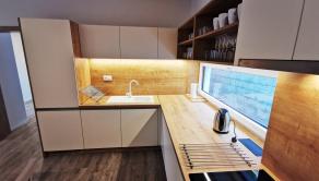 Kuchynský kút: elektrická rúra, rýchlovarná kanvica, chladnička, mraznička, umývačka riadu, kávovar, jedálenské posedenie, indukčná varná doska, príbory, riady, hrnce, naberačky
