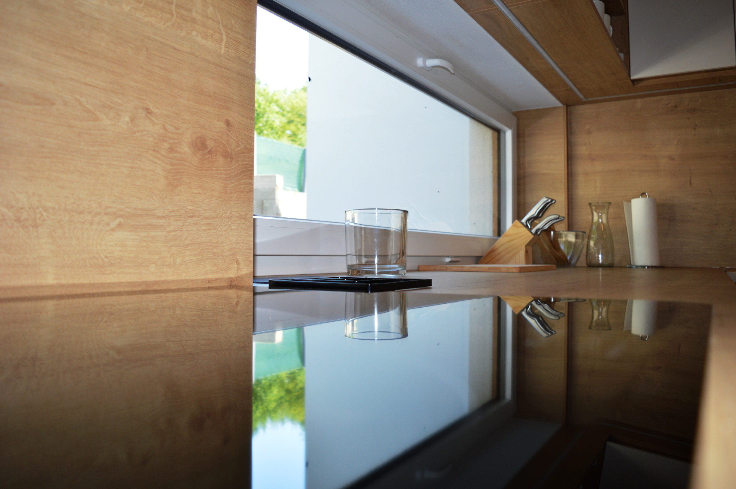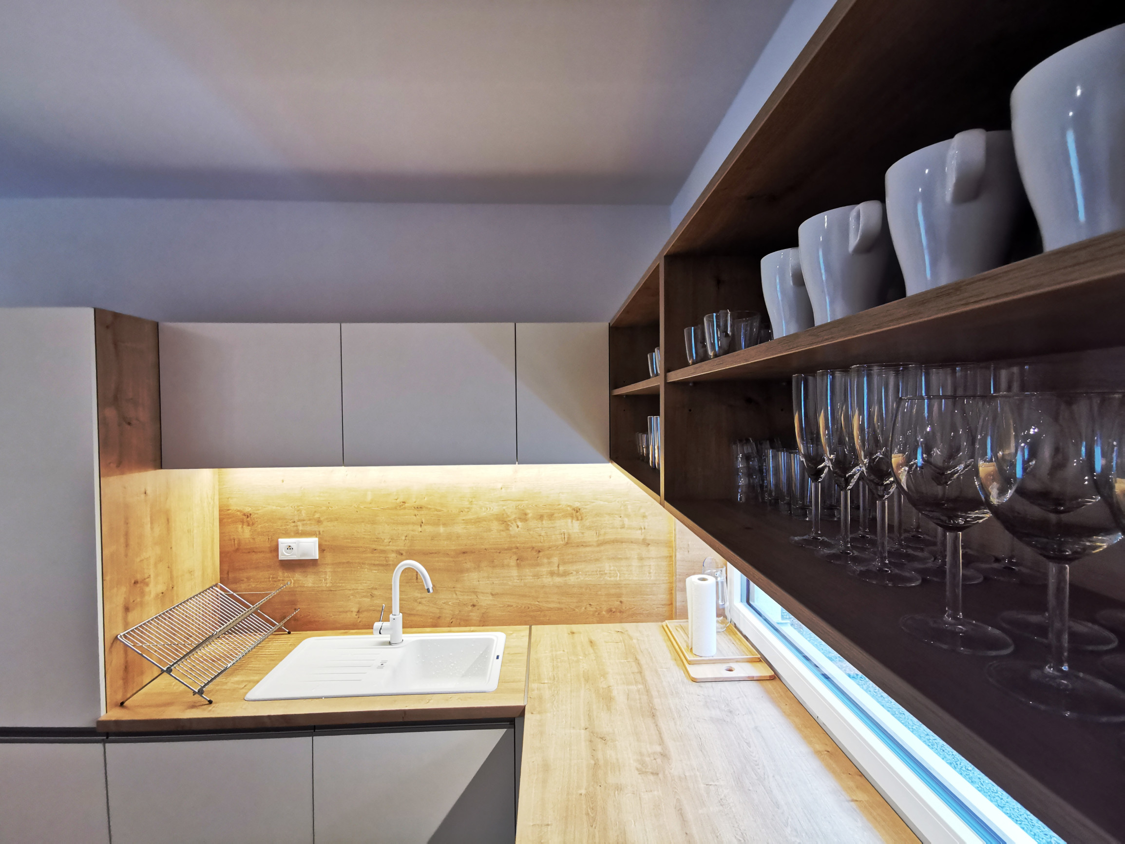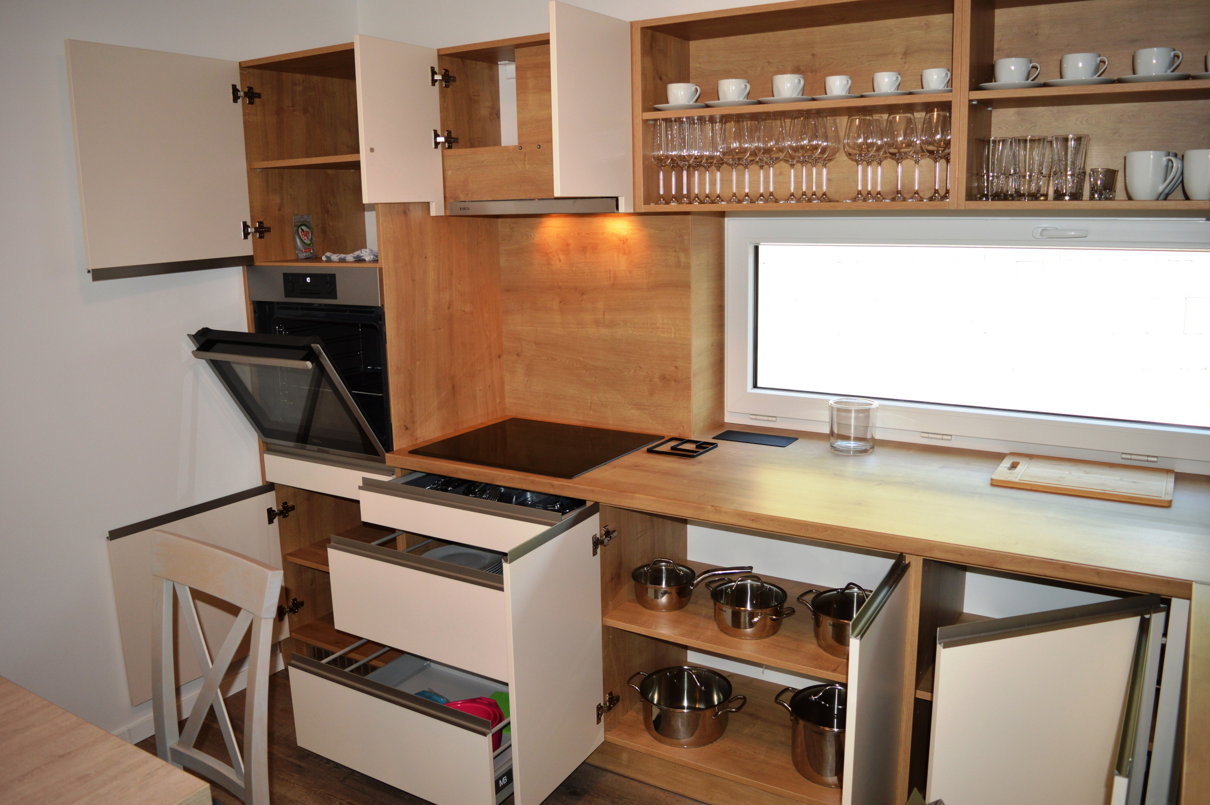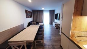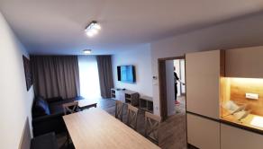 Kuchynský kút: elektrická rúra, rýchlovarná kanvica, chladnička, mraznička, umývačka riadu, kávovar, jedálenské posedenie, indukčná varná doska, príbory, riady, hrnce, naberačky
