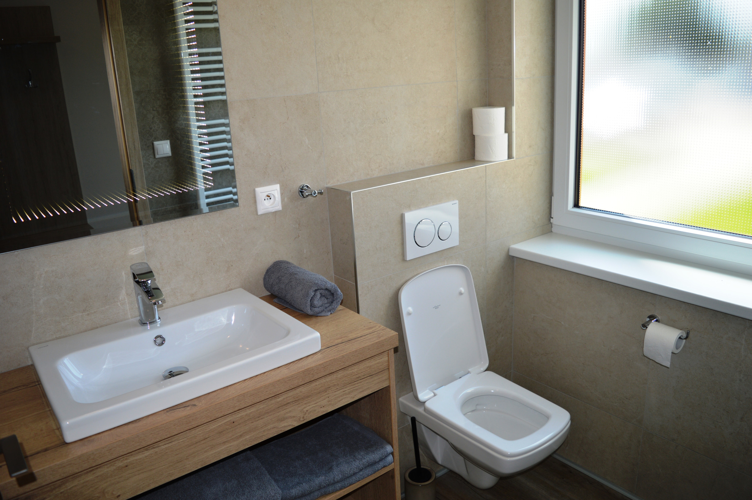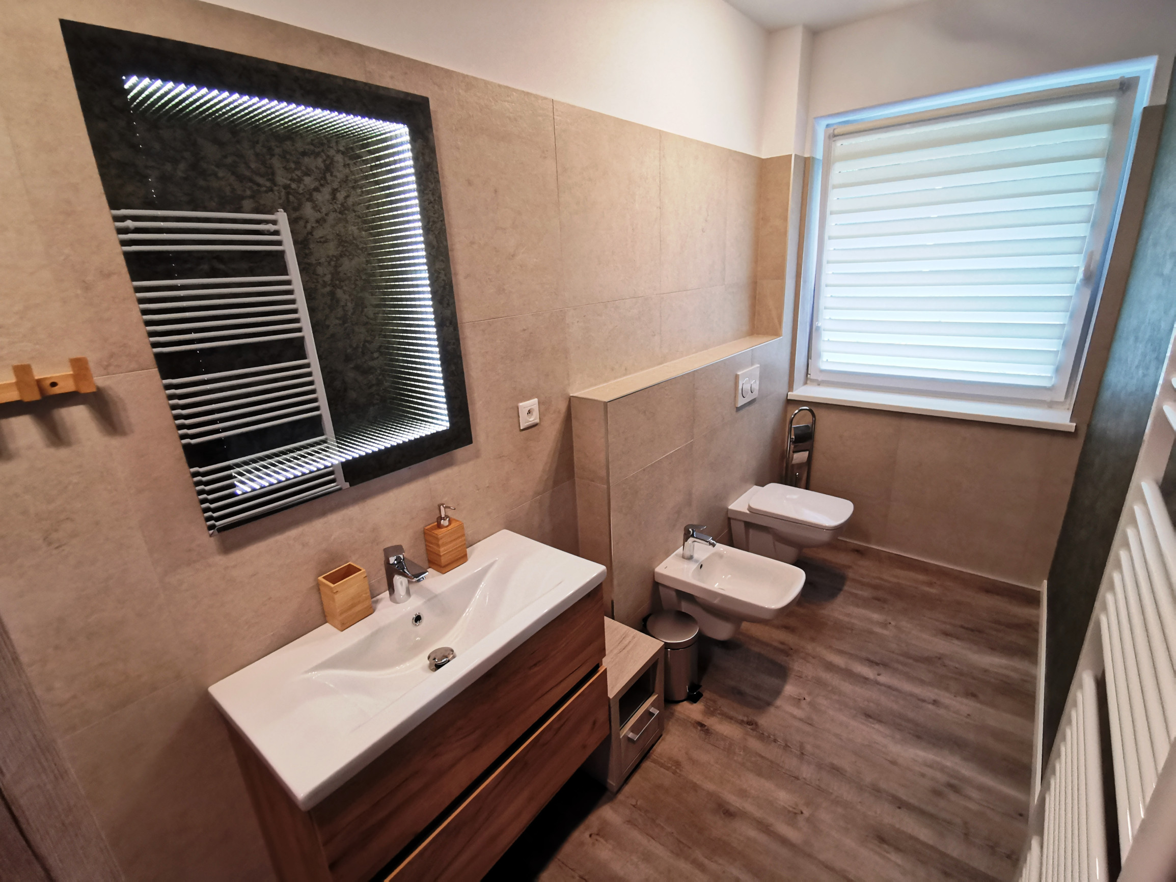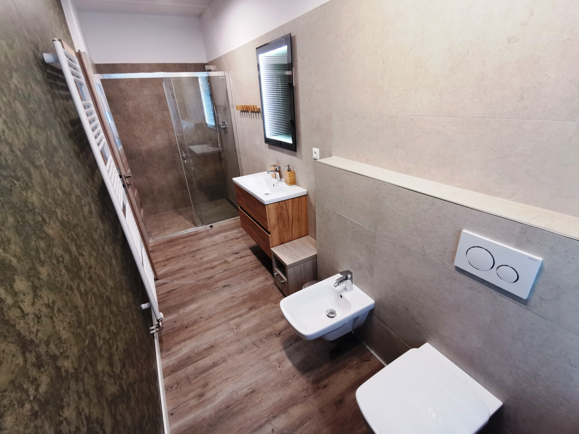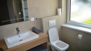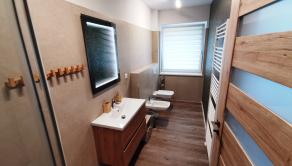 2x kúpeľňa s toaletou: sprchovací kút, umývadlo, WC, bidet, stojan na sušenie prádla, uteráky