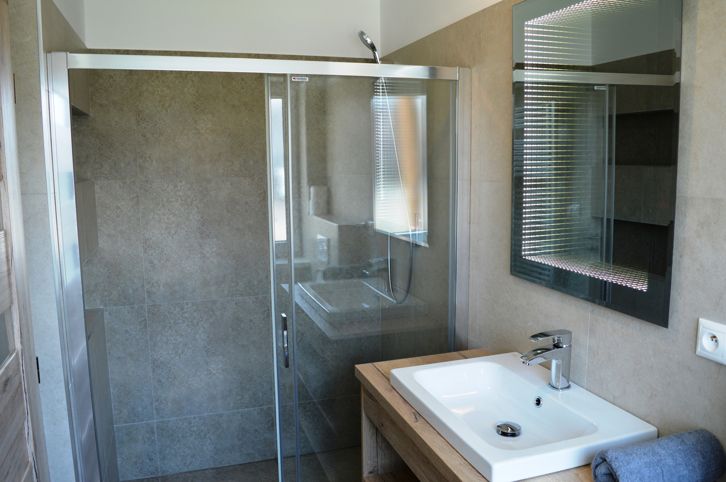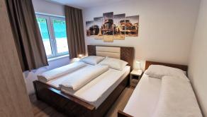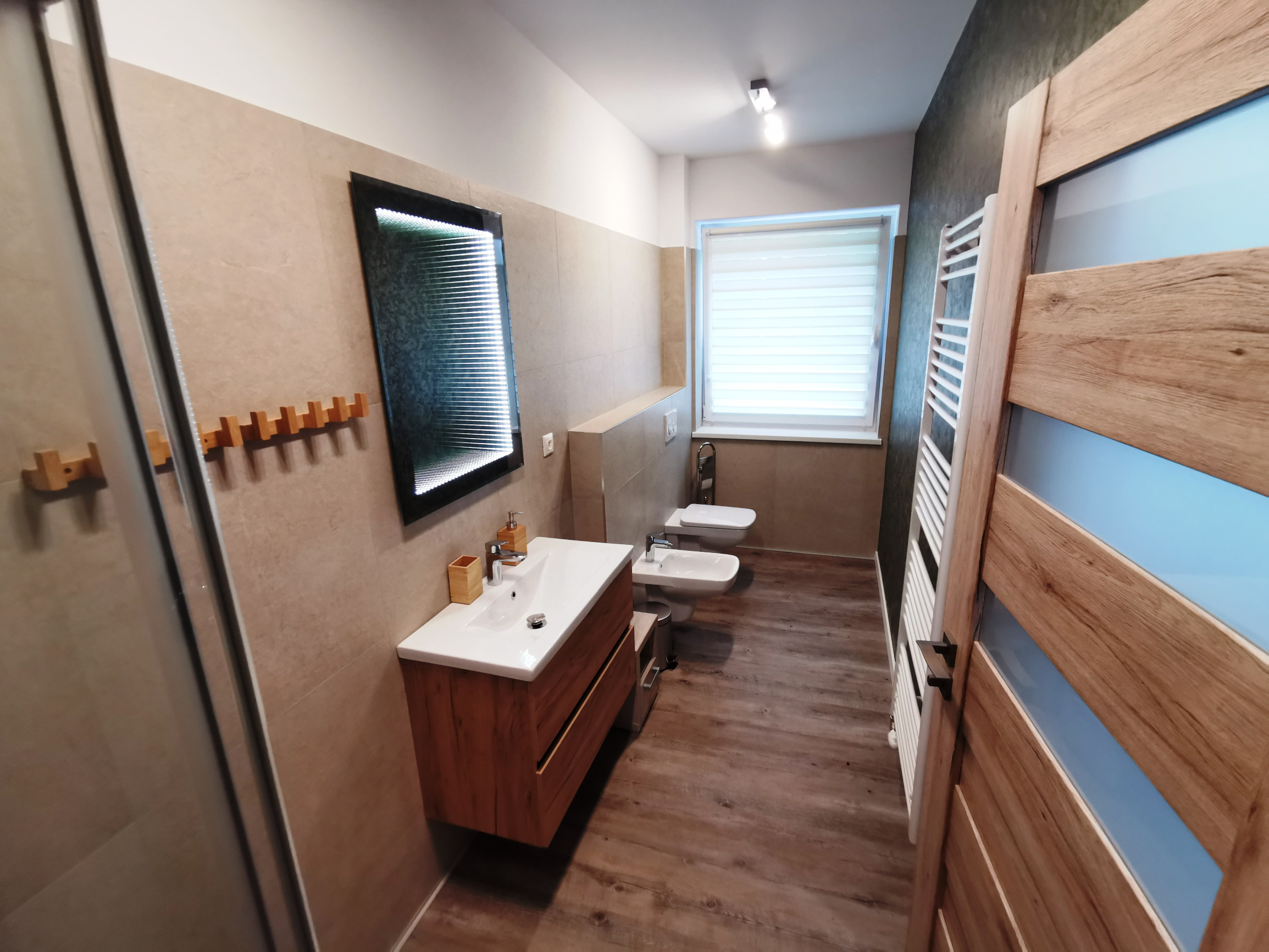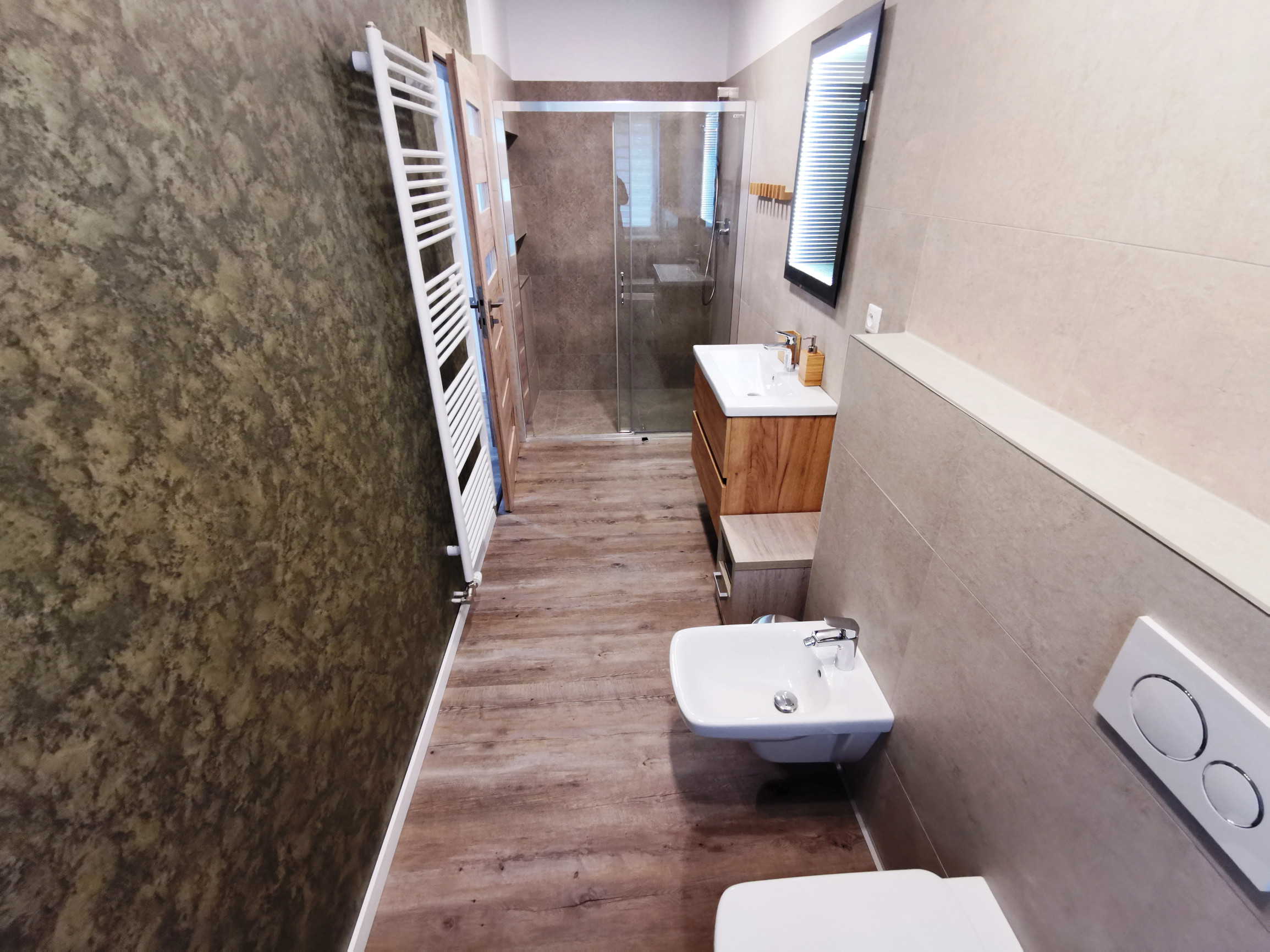 2x kúpeľňa s toaletou: sprchovací kút, umývadlo, WC, bidet, stojan na sušenie prádla, uteráky