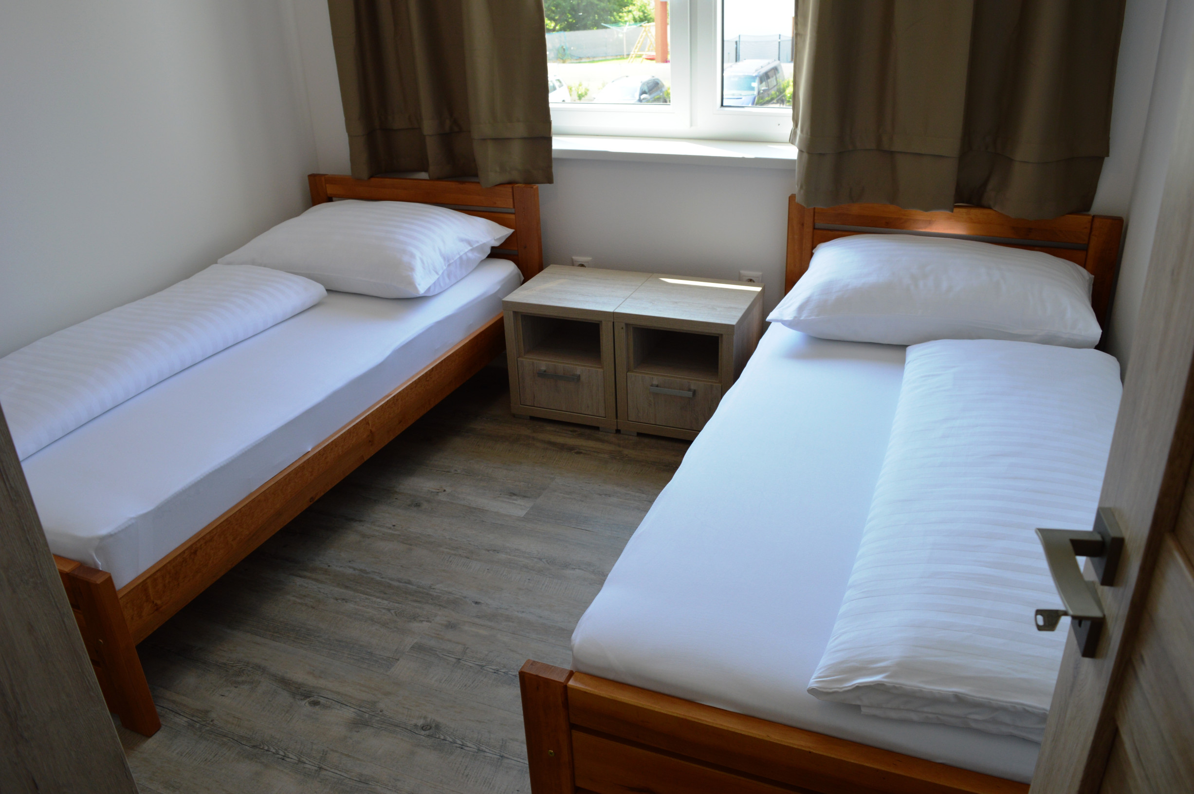 Domčeky sa skladajú z prízemného podlažia, kde sa nachádza zádverie, so vstupom do kúpeľne(sprchovací kút, toaleta a umývadlo) a vstupom do haly odkiaľ sa dostaneme do prepojenej obývacej izby s kuchyňou, ktorá je kompletne zariadená všetkým kuchynským príslušenstvom, vrátane vstavaných spotrebičov a kuchynského riadu, z obývacej izby je vstup na terasu. Z haly sa ďalej dostaneme do technickej miestnosti a do skladu, ktorý je možno využiť pre uskladnenie napríklad športových potrieb.