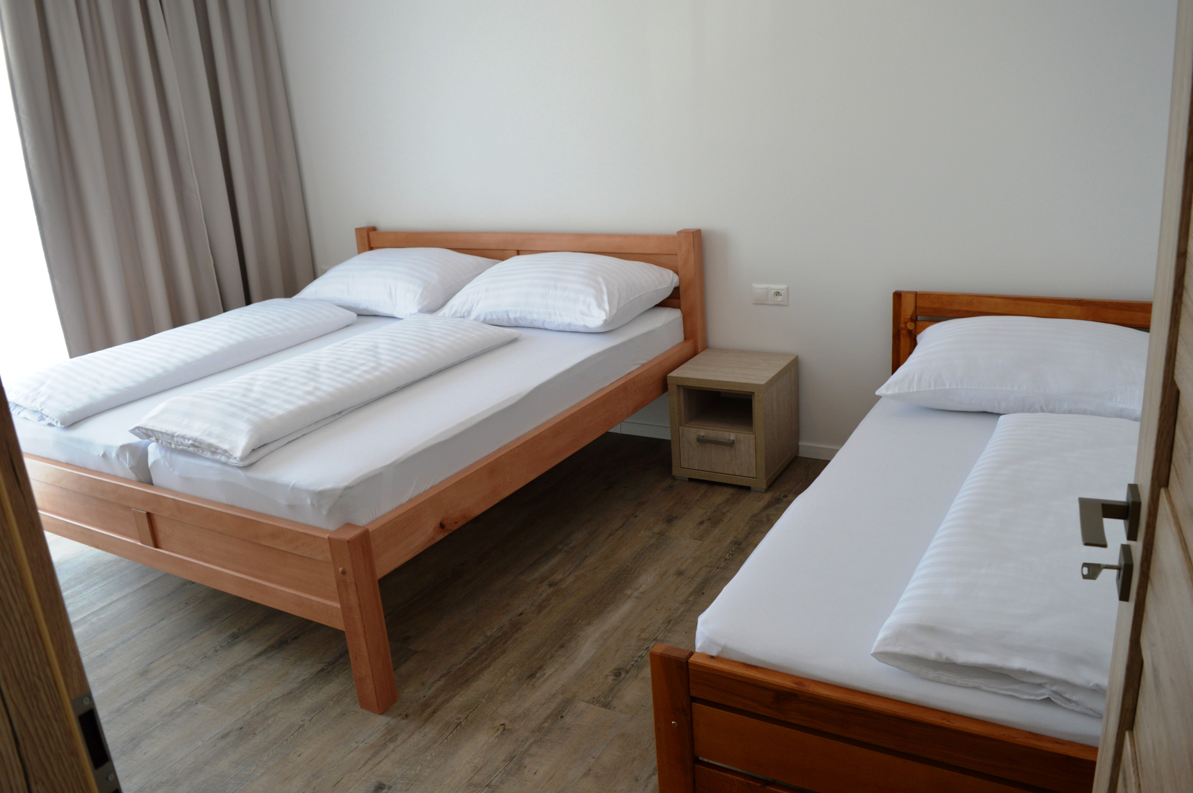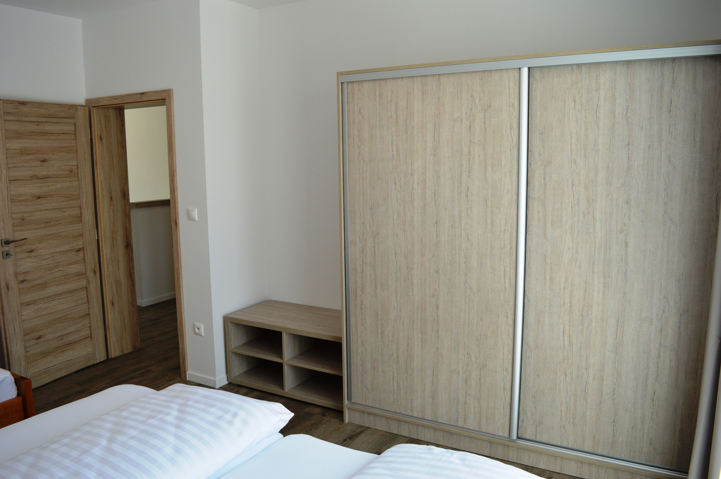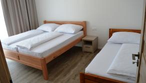 Prvé nadzemné podlažie sa skladá zo vstupnej haly, troch navzájom nepriechodných izieb a kúpeľne so sprchovacím kútom, umývadlom, toaletou a bidetom.