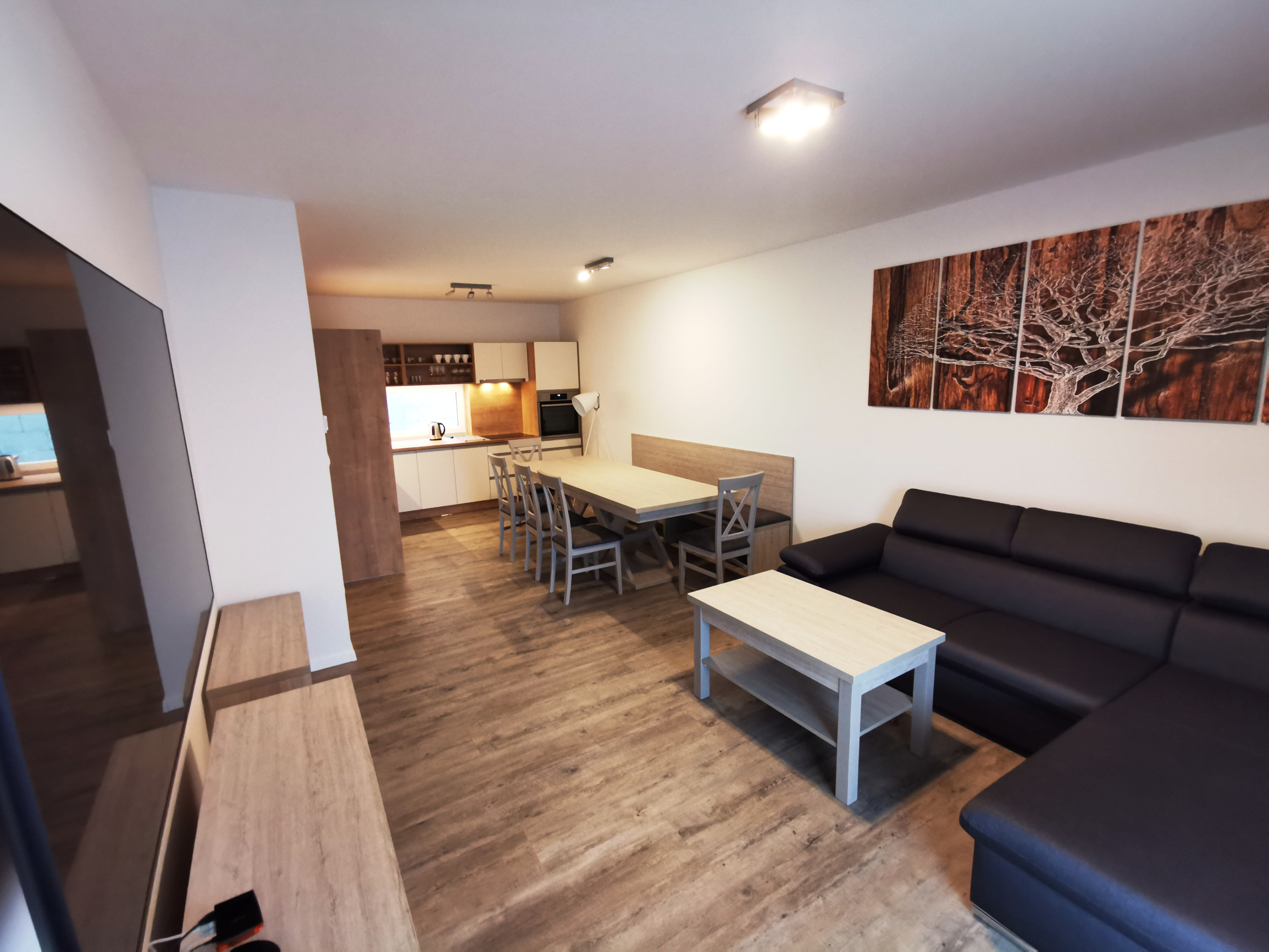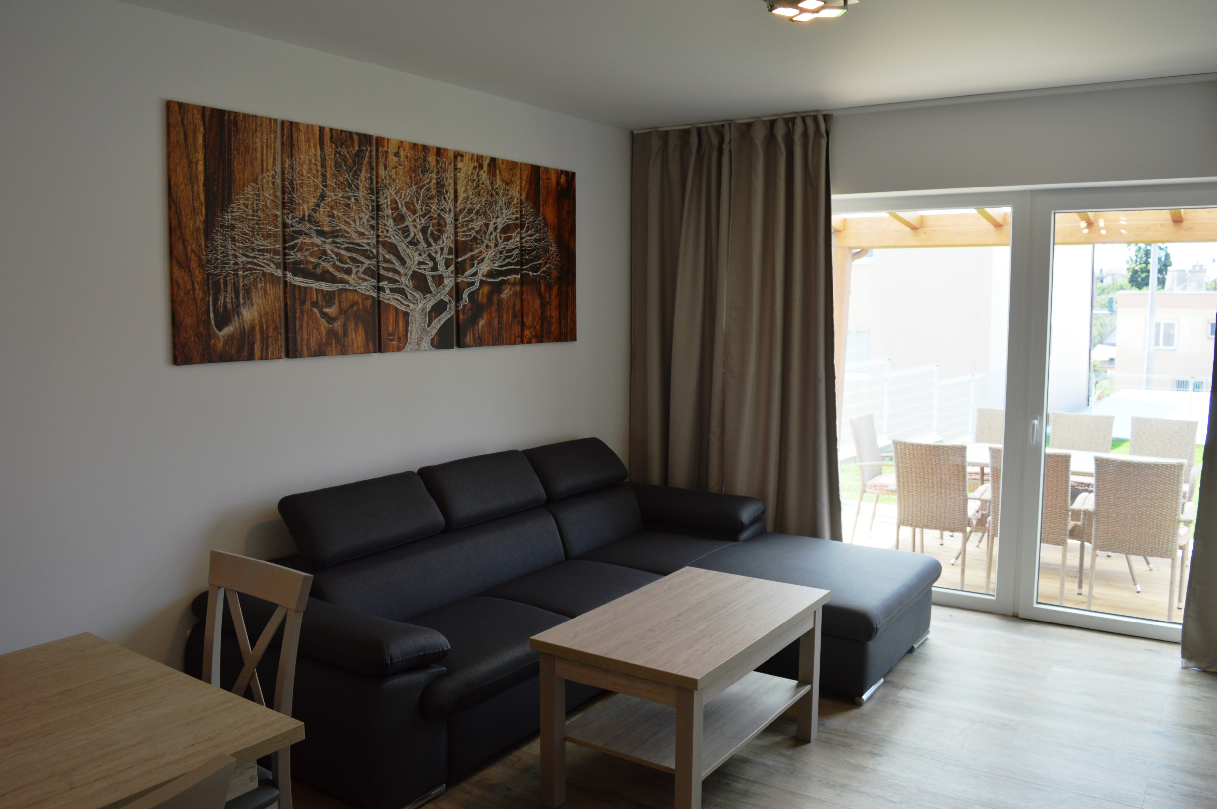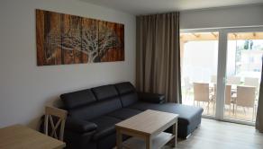 Obývacia miestnosť: televízor, satelit, gauč, terasa
