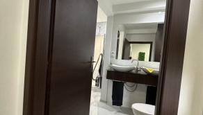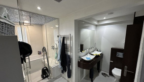 Kúpeľne: Hlavná kúpeľňa s WC, vaňou, veľkým sprchovým kútom, elektrickým radiátorom, dvomi umývadlami a miestom pre práčku a sušičku. Samostatné WC s umývadlom
