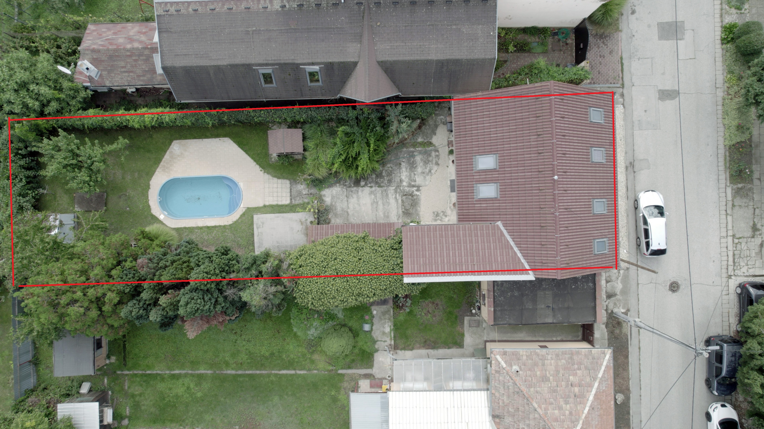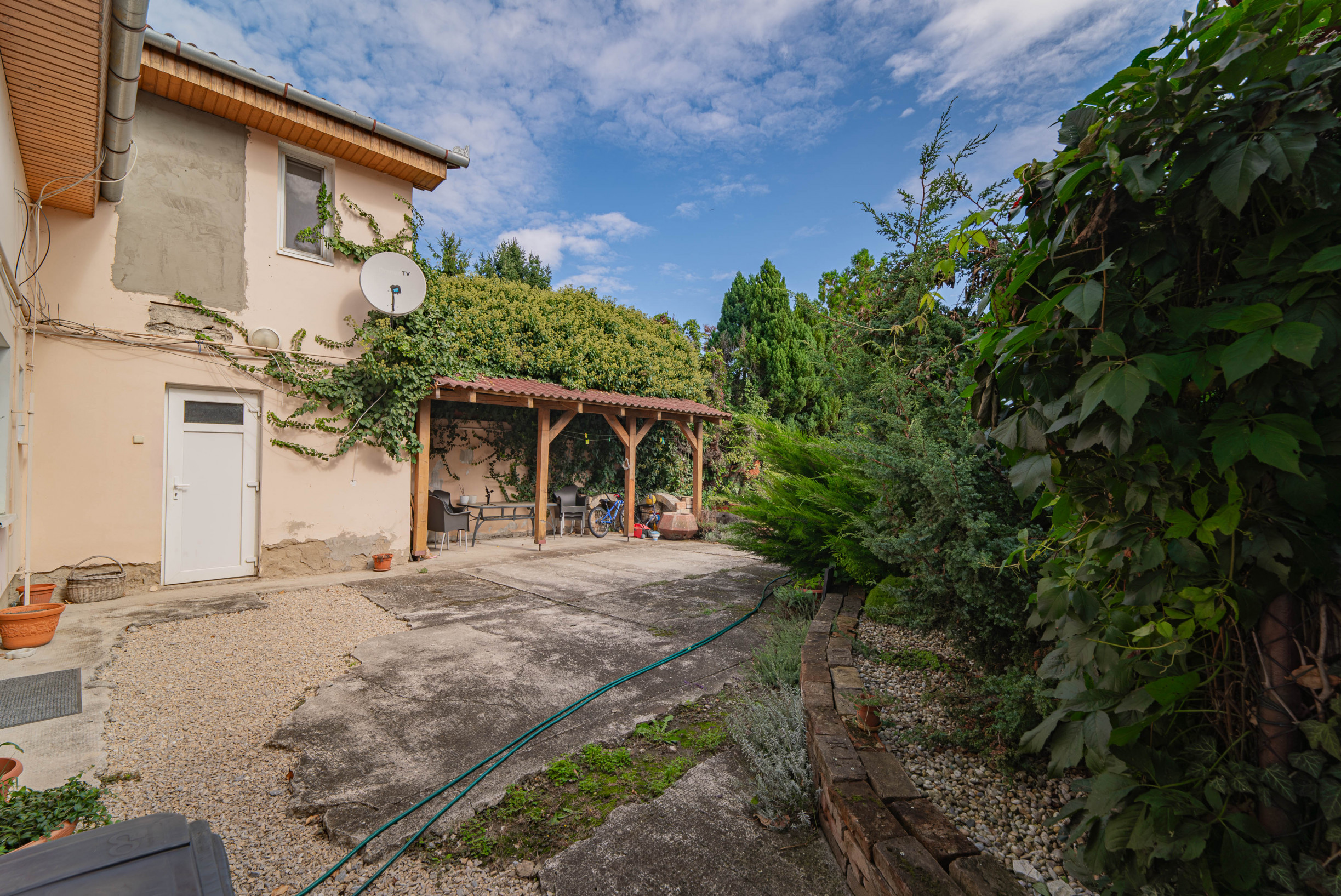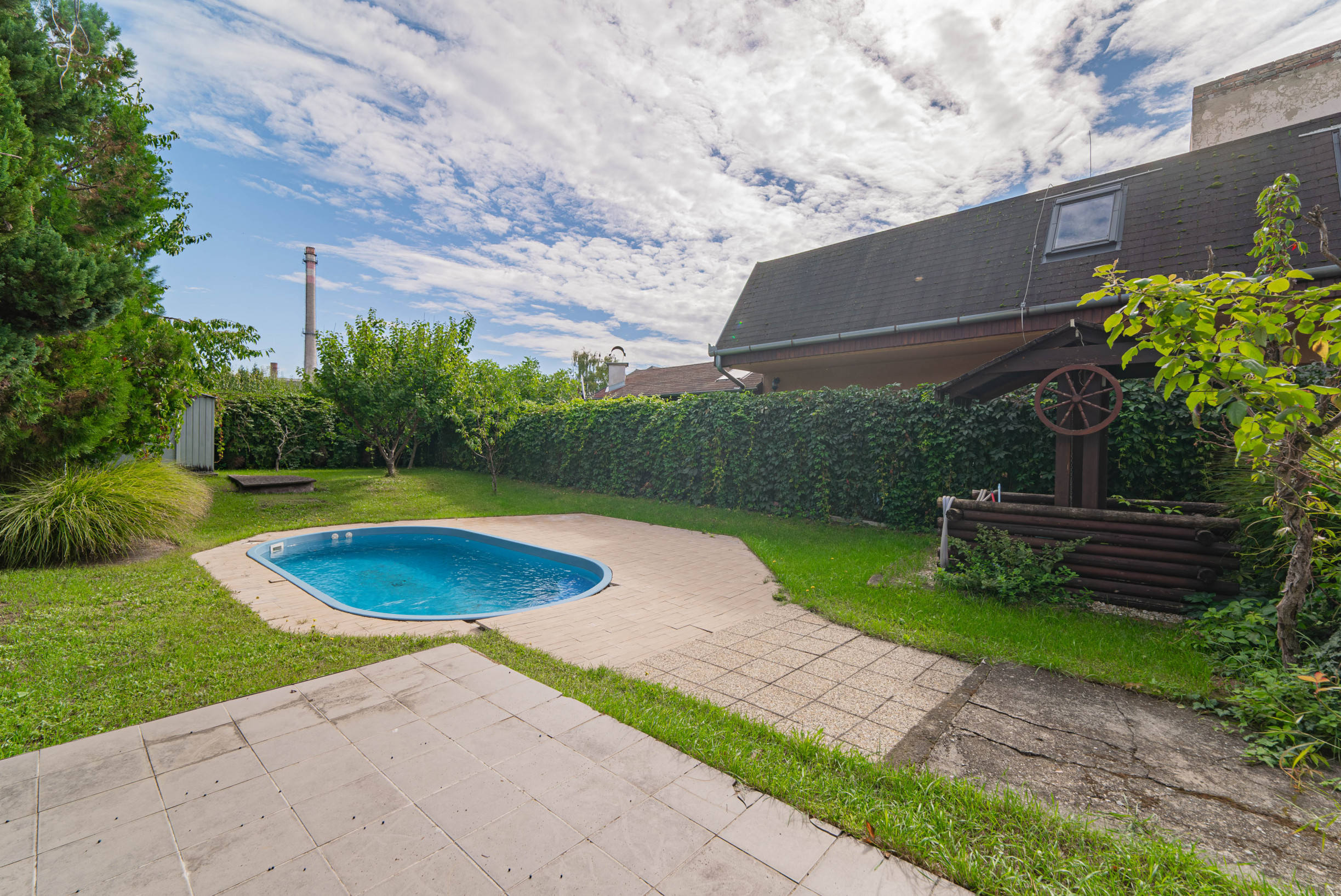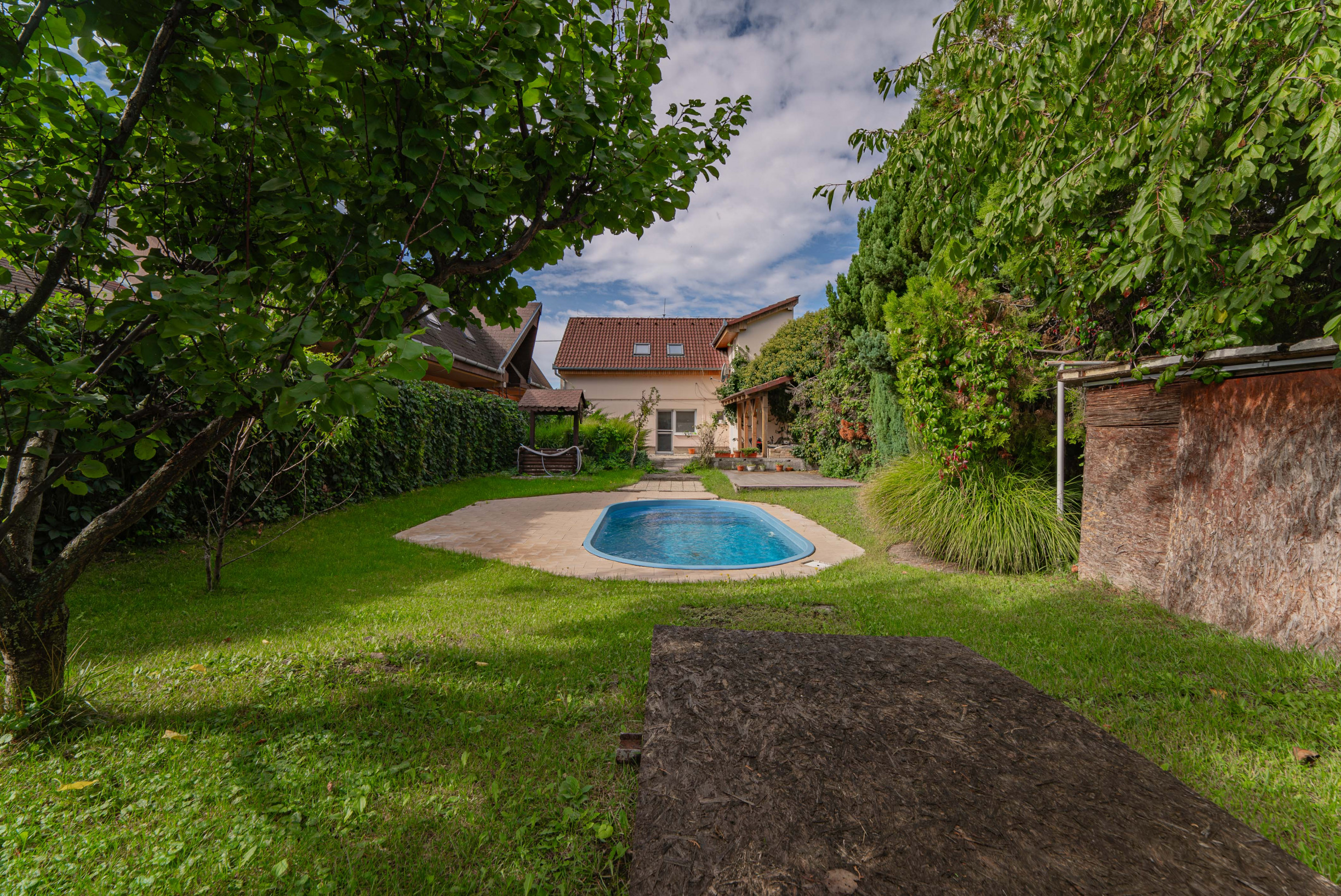 Pozemok s rozlohou 399 m² poskytuje maximálne súkromie a priestor na oddych. Zastavaná plocha a nádvorie predstavujú 144 m². Na pozemku sa nachádza drevený prístrešok kde môžete tráviť letné večery s priatelmi. Záhrada je udržiavaná a poskytuje maximálne súkromie kvôli oploteniu a porastom ktorý obkolesuje celú záhradu a dodáva pocit prírody v tomto priestore. Ako veľký bonus, pre nového majiteľa čaká aj zapustený bazén s pieskovou filtráciou pre osvieženie v horúcich letných dňoch. Na záhrade sa nachádza aj vlastná studňa.