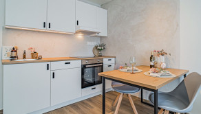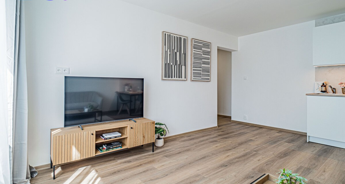Svetlá obývacia izba s kuchynským kútom – srdce bytu určené na spoločné chvíle aj pokojný oddych.