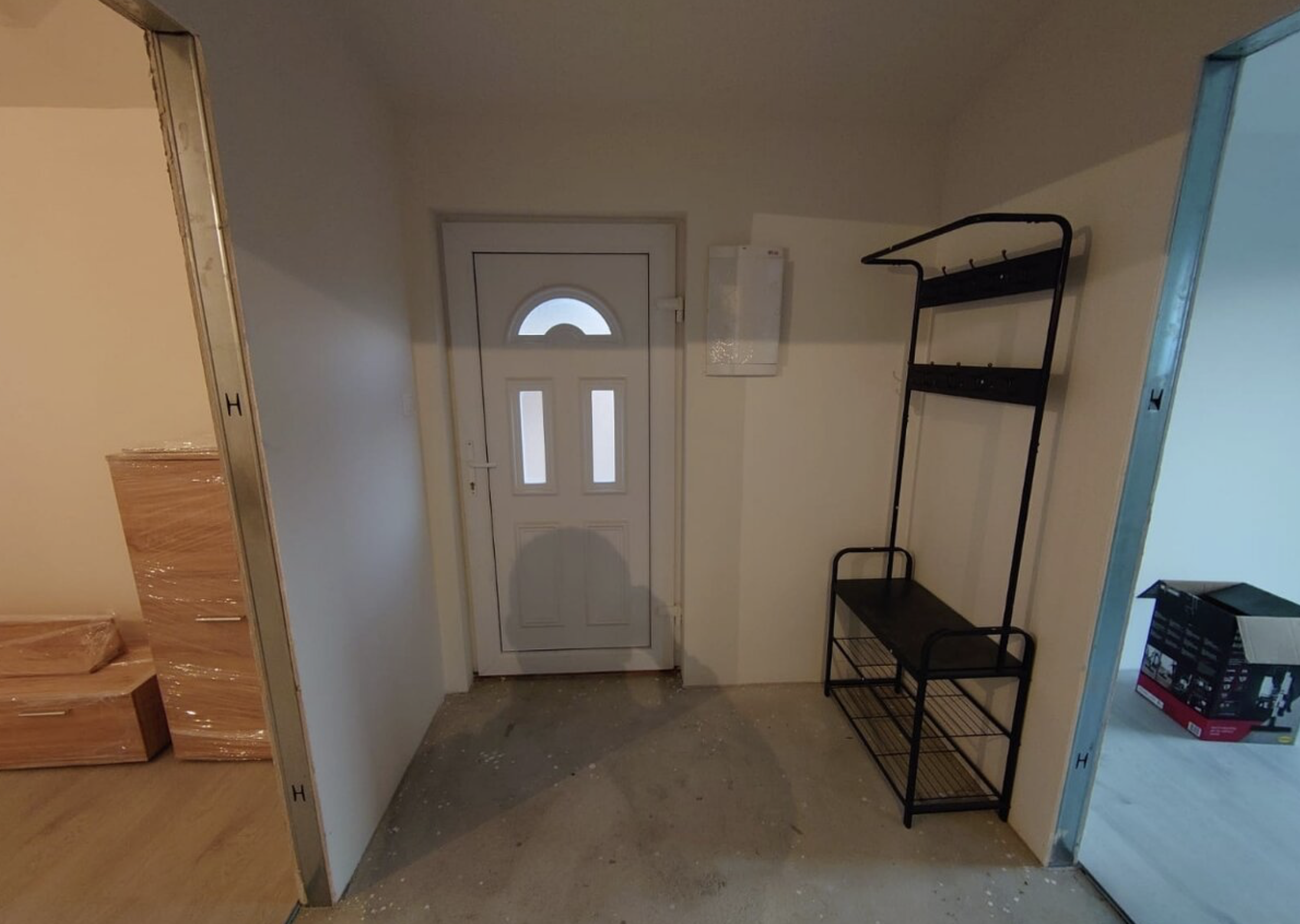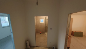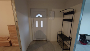 Vstupná chodba, kuchyňa s obývacou časťou,spálňa,chodba, samostatné WC a priestranná kúpeľňa zo sprchovým kútom.Velký prístrešok pred dverami.