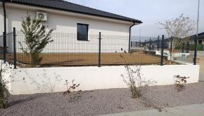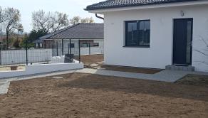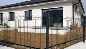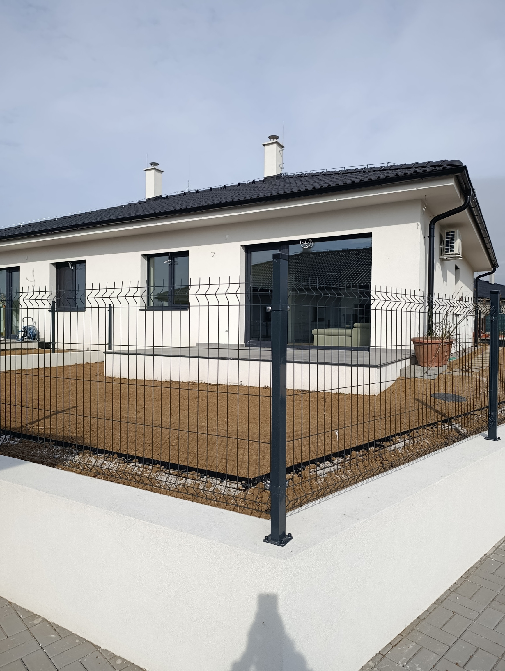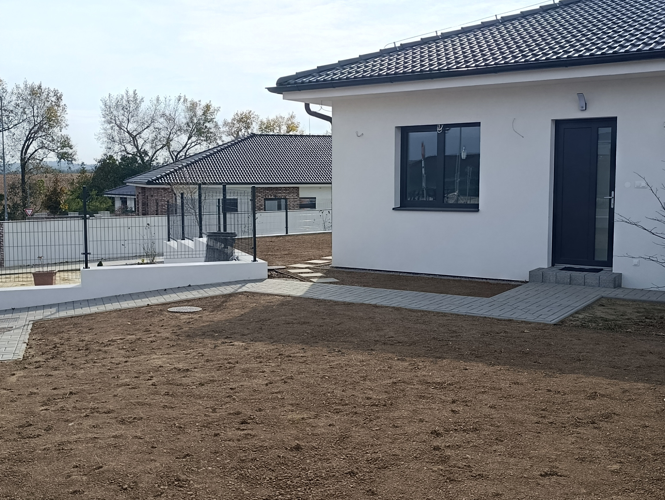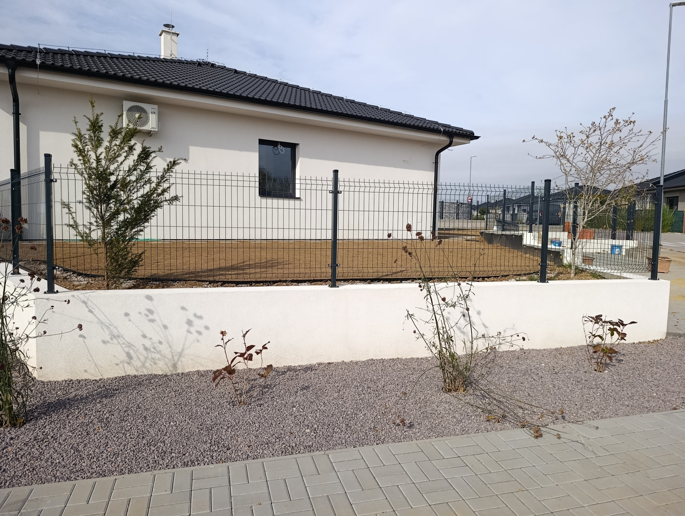 Pozemok je kompletne oplotený a upravený – s výsadbou trávnika, okrasných drevín a skálok.