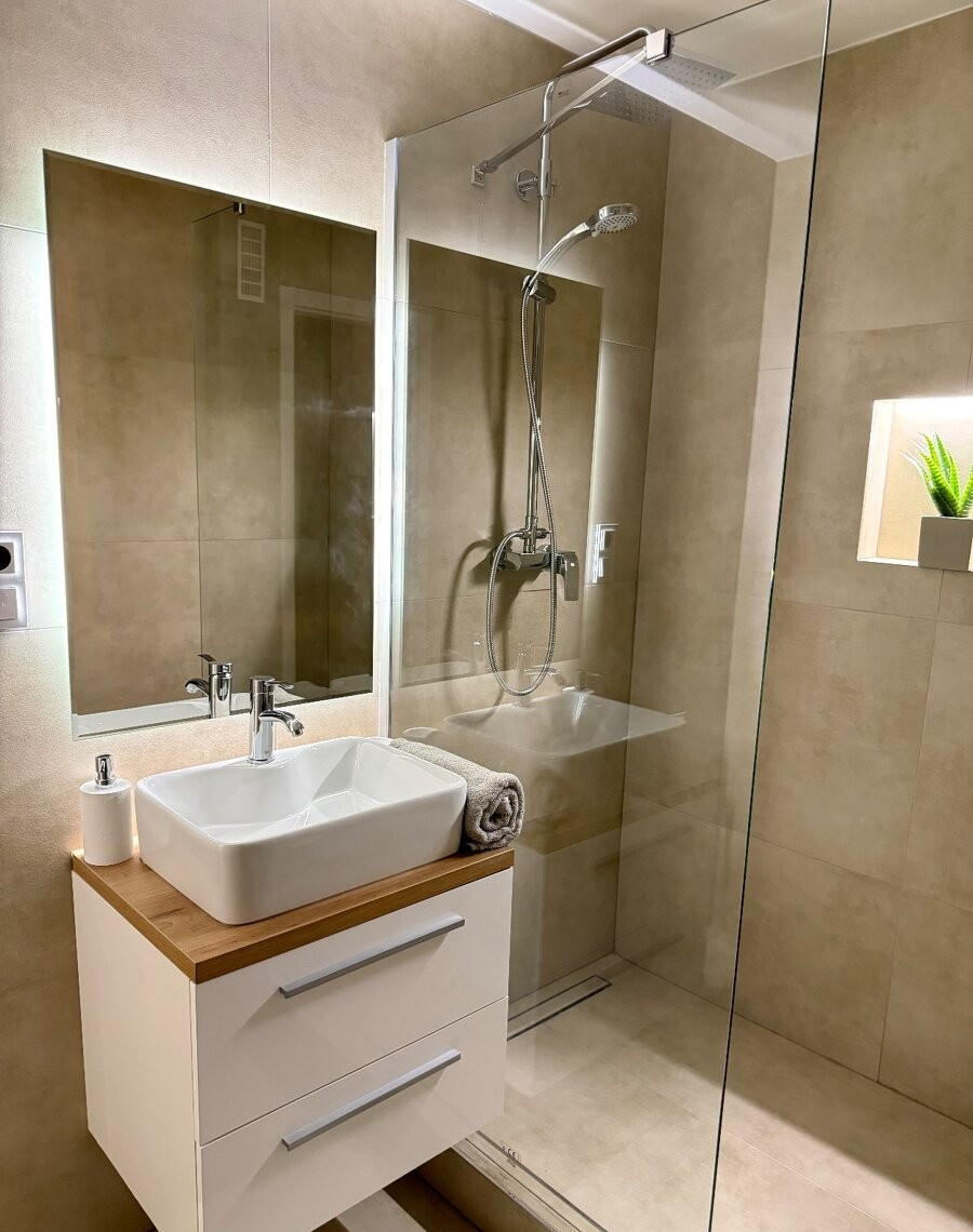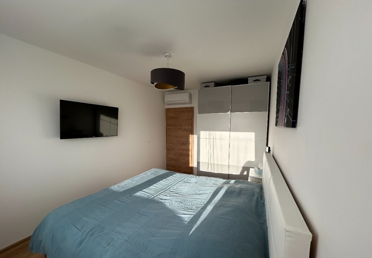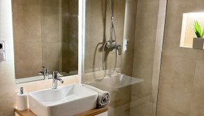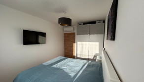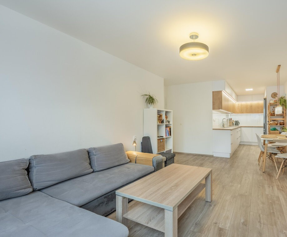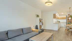 VÝBORNÁ DISPOZÍCIA BYTU – denná a nočná časť: vzdušná vstupná hala s úložným priestorom, slnečná obývacia izba prepojená s kuchyňou a jedálenskou častou. Z obývacej časti je výstup priamo na terasu. Tri samostatné spálne, samostatná kúpeľňa so sprchovým kútom a toaletou a ďalšia samostatná toaleta