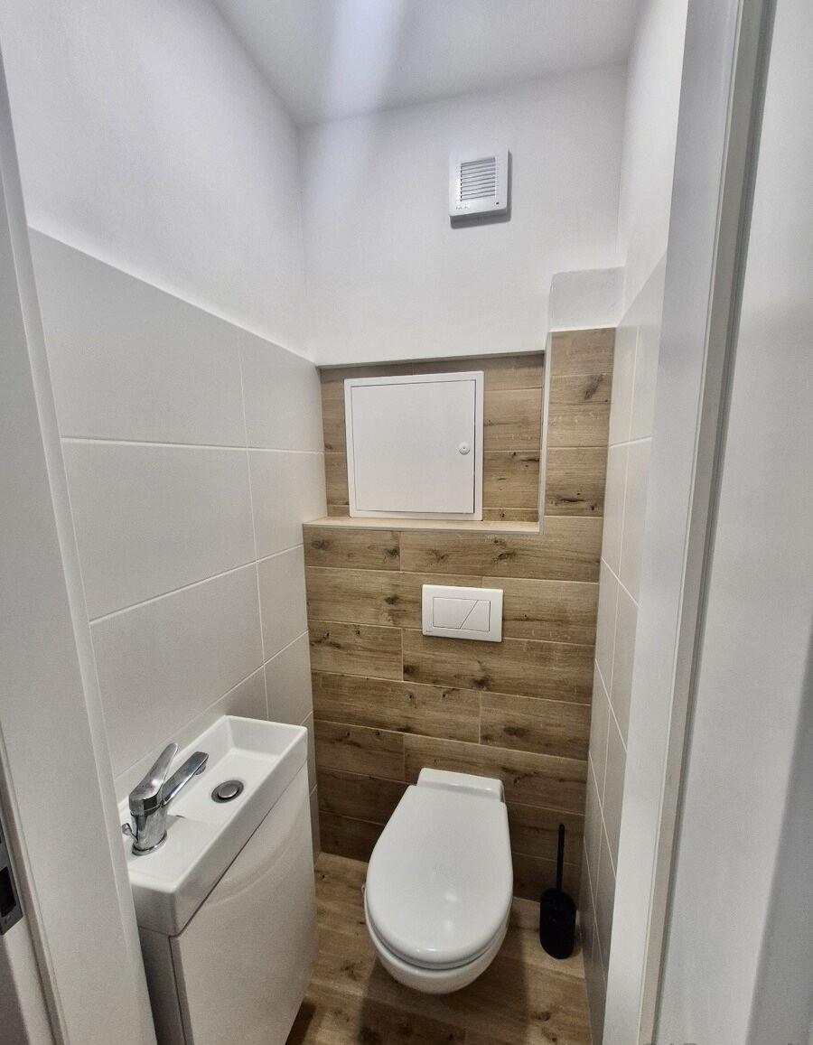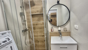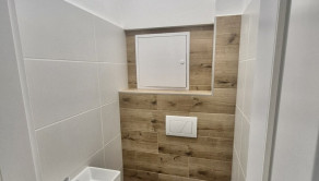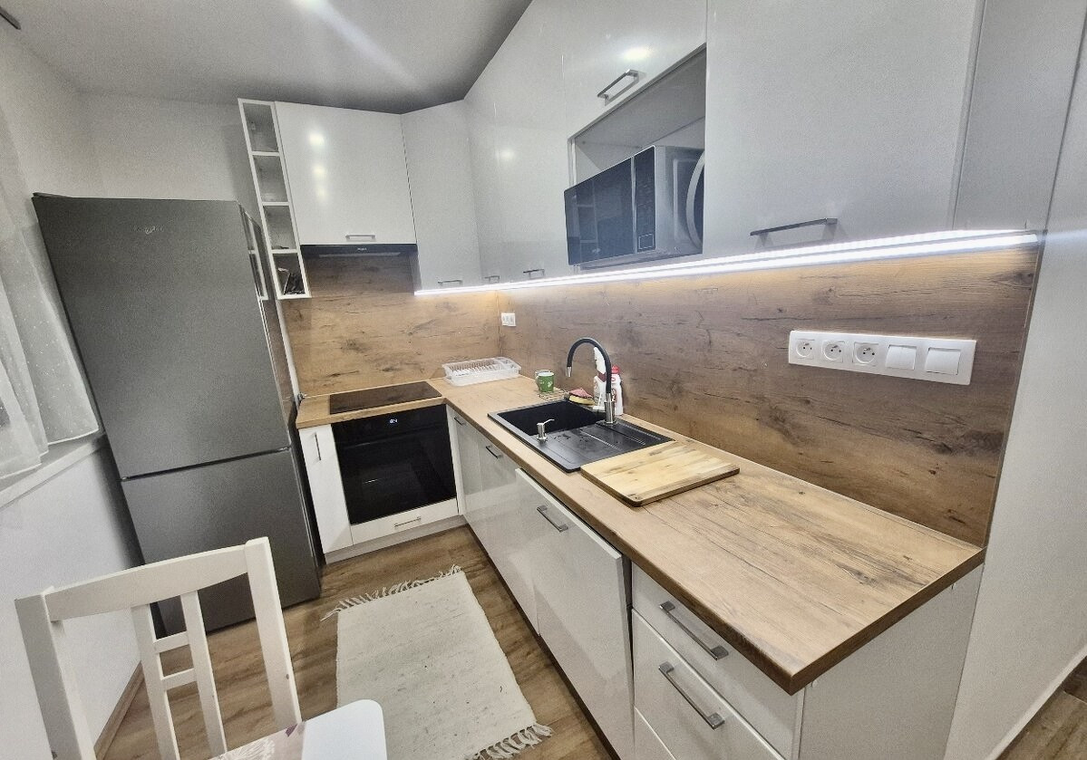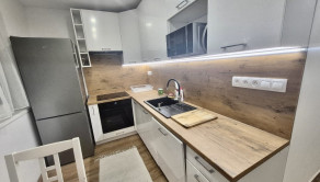 Kompletná rekonštrukcia: nová elektro-inštalácia, maľovka, omietky, podlahy, znížené stropy s bodovými svetlami, nová kúpeľňa so sprchovacím kútom aj práčkou, samostatné WC s umývadlom, úplne nová kuchynská linka s novými zabudovanými spotrebičmi značky Whirlpool : chladnička s mrazničkou, indukčná doska, elektrická pec, umývačka riadu; mikrovlnka; obývačková stena s QLED TV; manželská posteľ, rozkladací gauč.