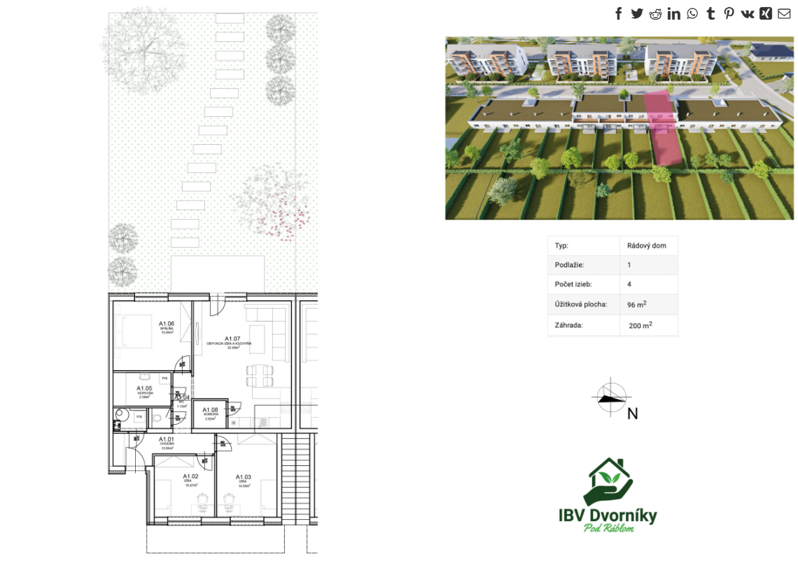 Domy zaujmú tichou lokalitou a rýchlym napojením na diaľnicu D1, s vlastnou nadštandardnou priestrannou záhradou s výmerou 200 m² a samozrejmosťou sú aj 2 parkovacie miesta v cene.
