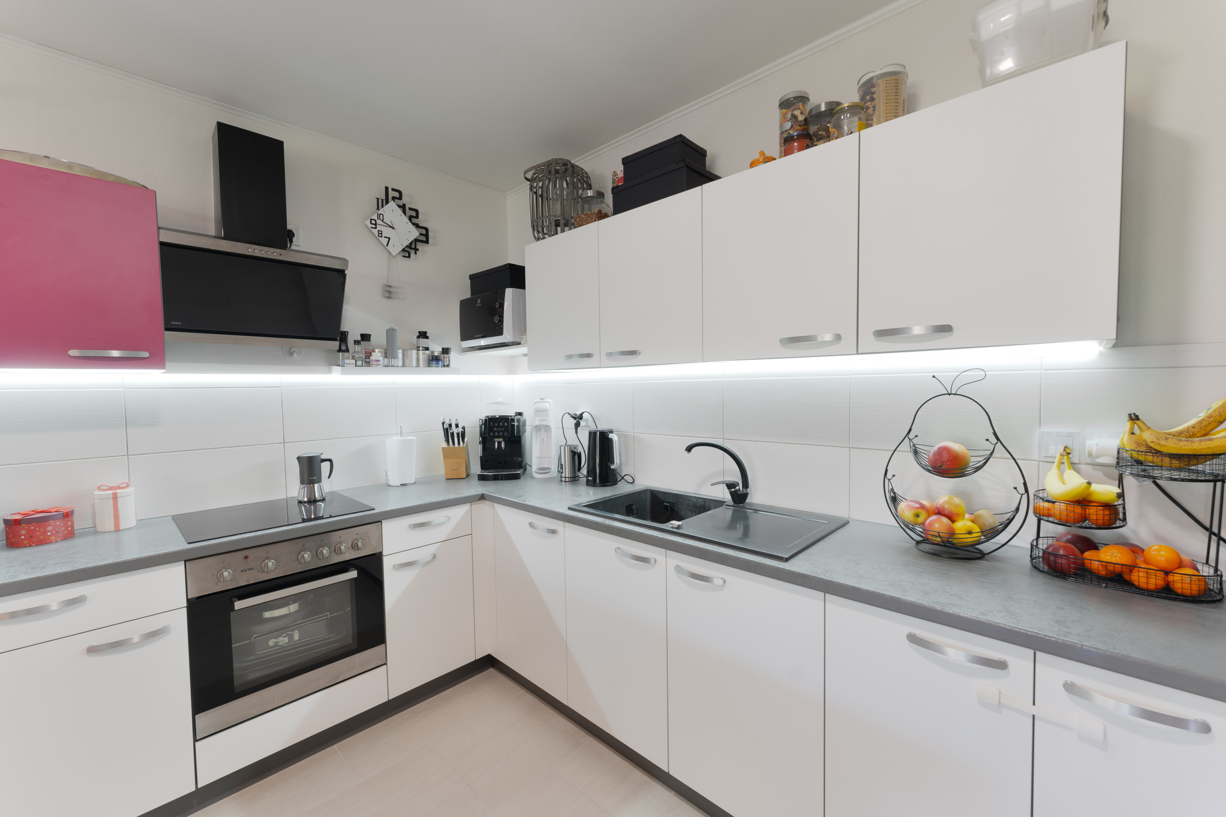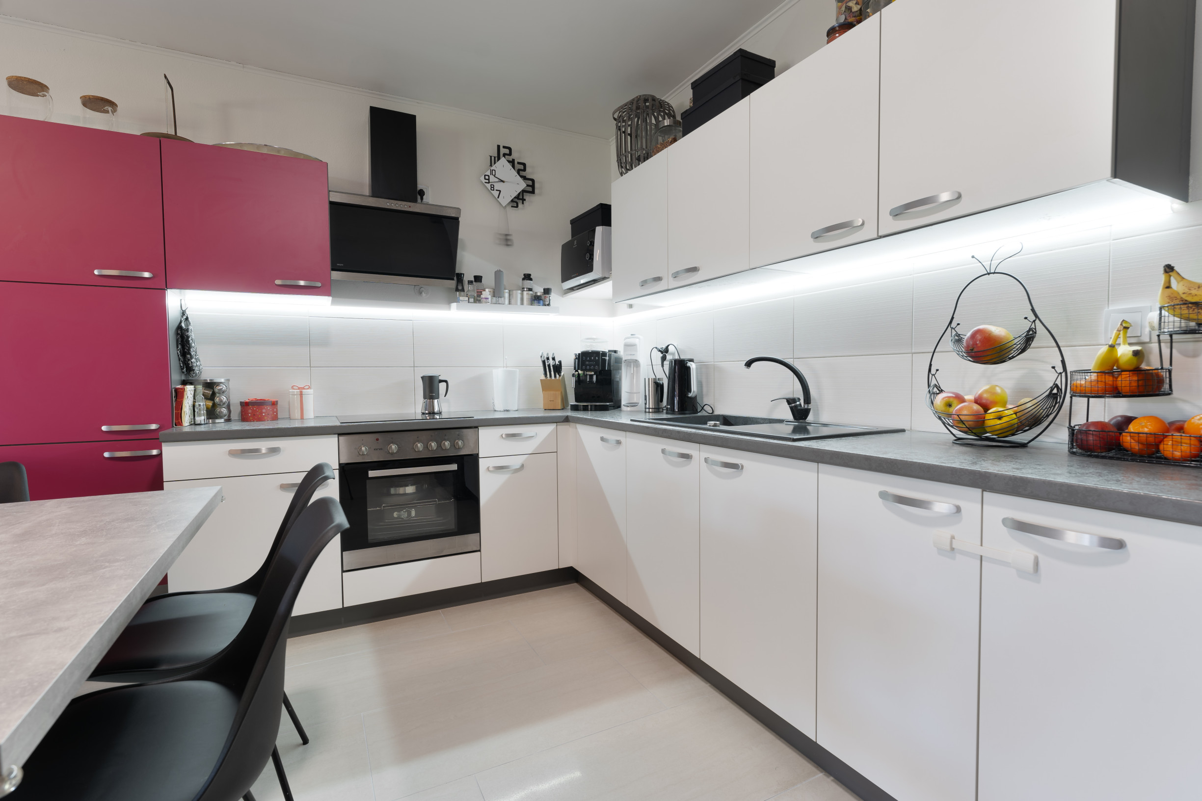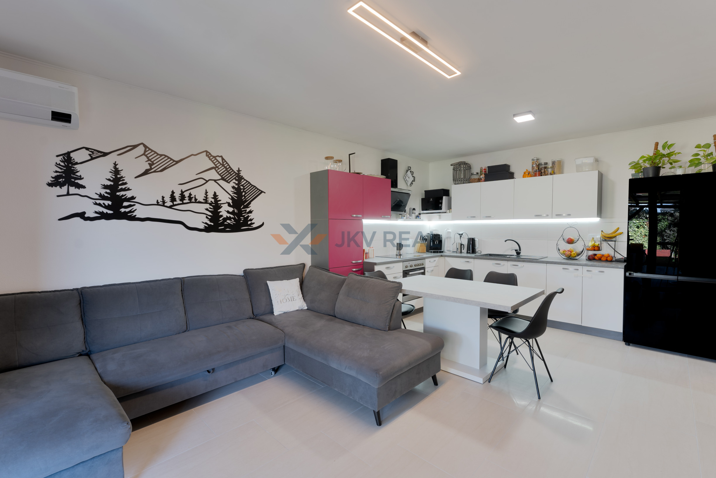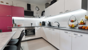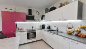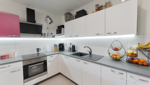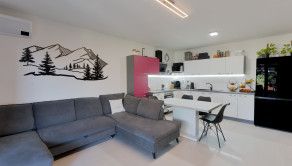 Srdcom domu je priestranná obývacia izba prepojená s kuchyňou a jedálenskou časťou, ktorá vytvára otvorený spoločenský priestor pre rodinu aj návštevy. Kuchyňa je prakticky riešená s dostatkom pracovnej plochy a úložného priestoru, pričom je vybavená všetkými potrebnými spotrebičmi. Moderné prevedenie kuchynskej linky spolu s jemným podsvietením vytvára príjemnú a funkčnú atmosféru pri varení aj stolovaní.