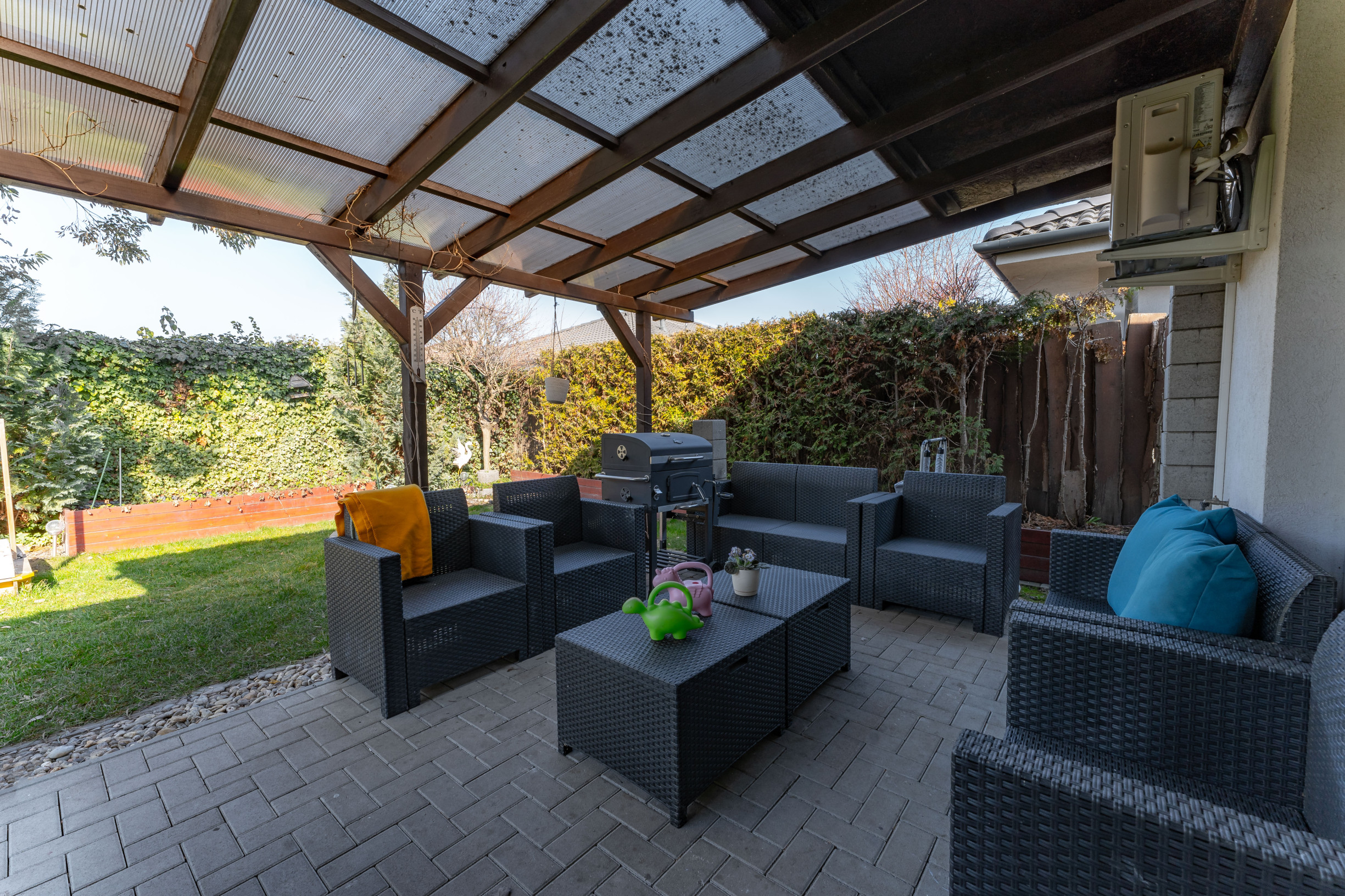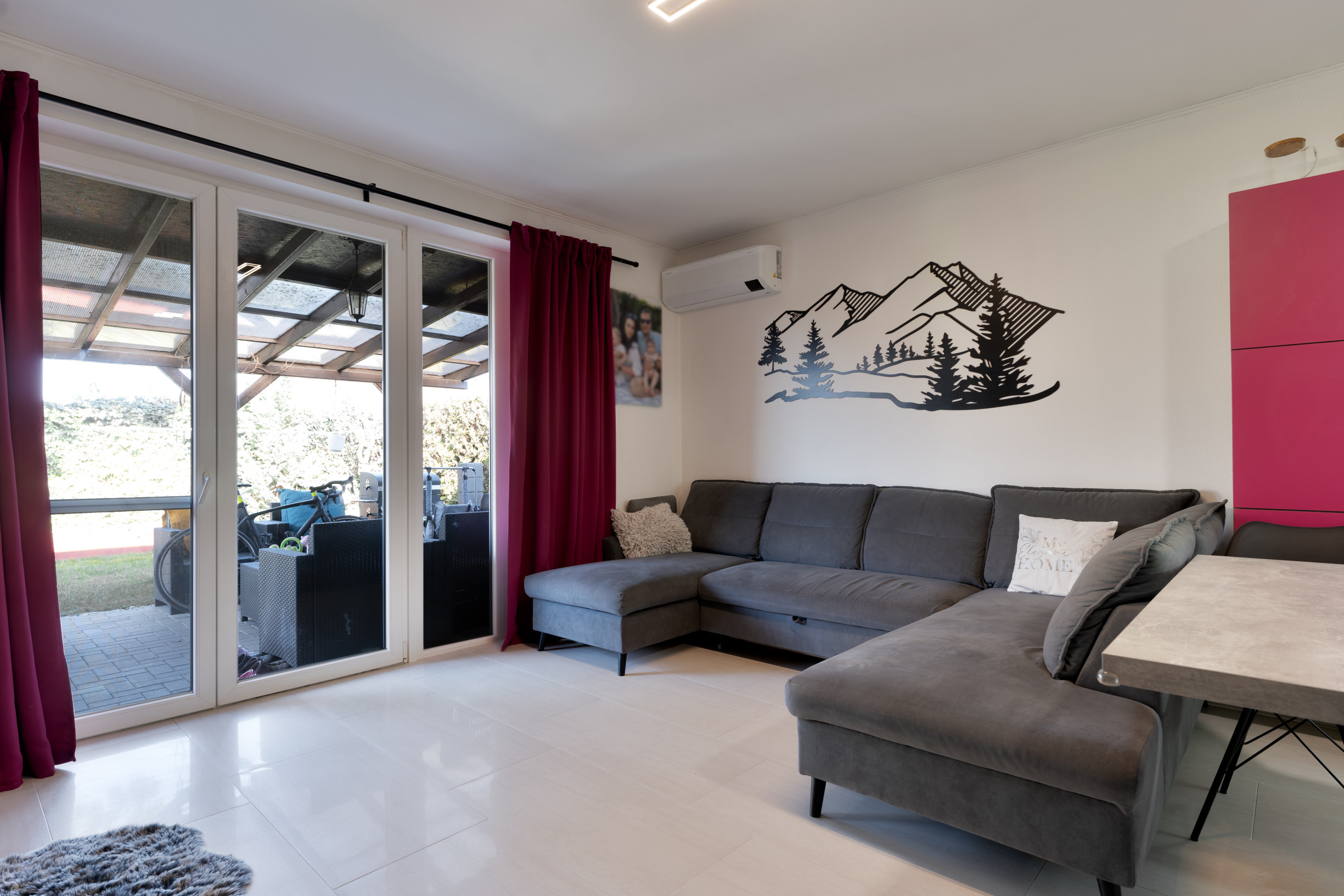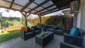 Priamo z obývacej izby sa vychádza na terasu, ktorá je ideálnym miestom na letné grilovanie, posedenie s priateľmi alebo oddych po náročnom dni. Terasa prirodzene prepája interiér domu so záhradou a vytvára tak príjemný priestor na trávenie voľného času.