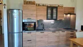 Kuchynská linka s kvalitnými spotrebičmi: chladnička, indukčná varná doska, elektrická rúra, mikrovlnka, digestor