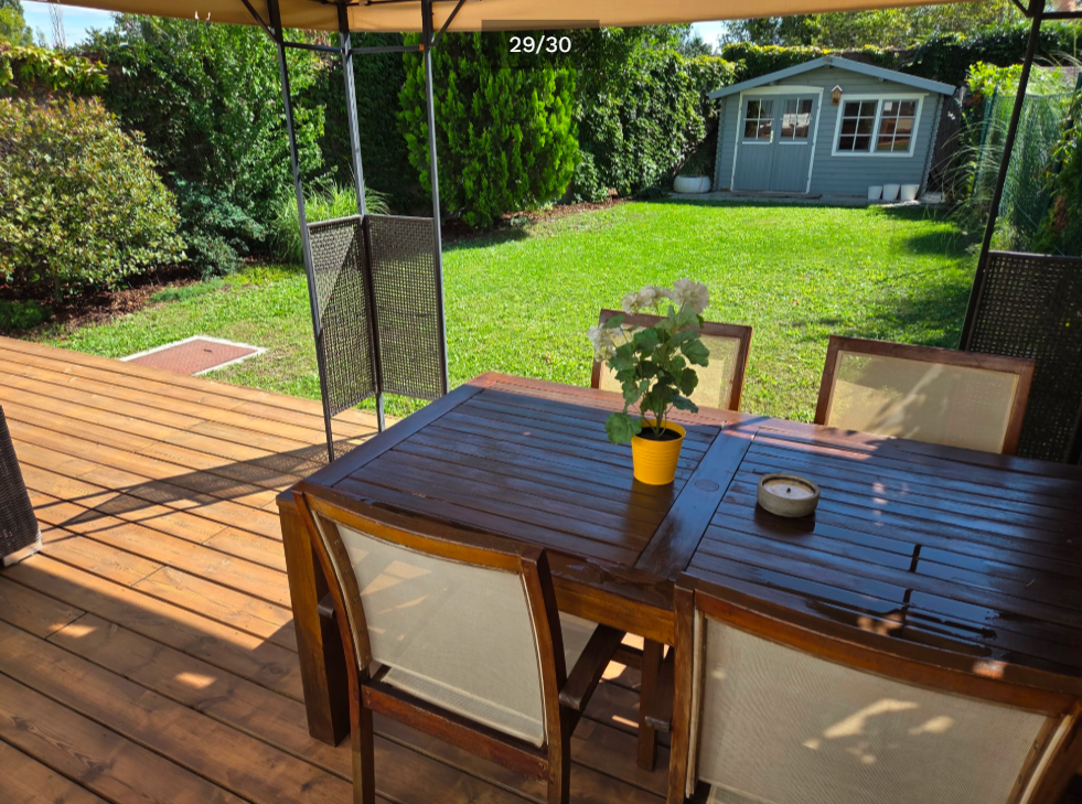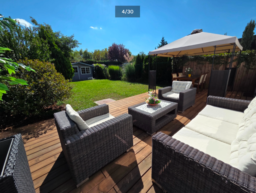Záhrada: Okrasná záhrada je napojená na samostatnú vŕtanú studňu (15.m) s automatickou závlahou. Záhrada je spojená s veľkou drevenou terasou (40.m2) so záhradným nábytkom a altánkom. Na záhrade je umiestnený Záhradný drevený domček a druhý domček na náradie a techniku.