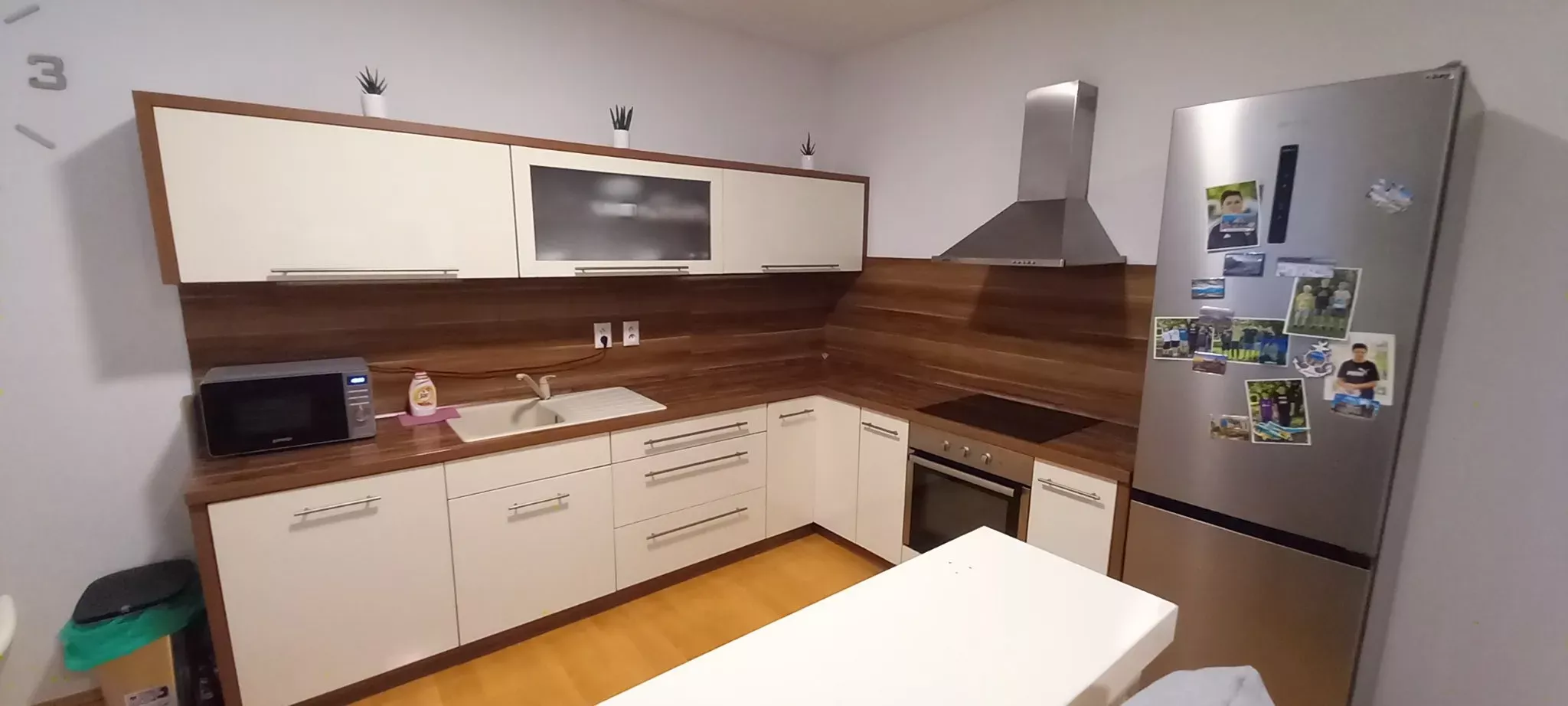 Vstupná časť: obývacia izba spojená s kuchyňou, plne vybavená spotrebičmi