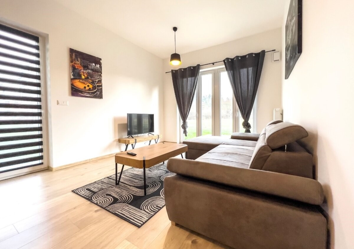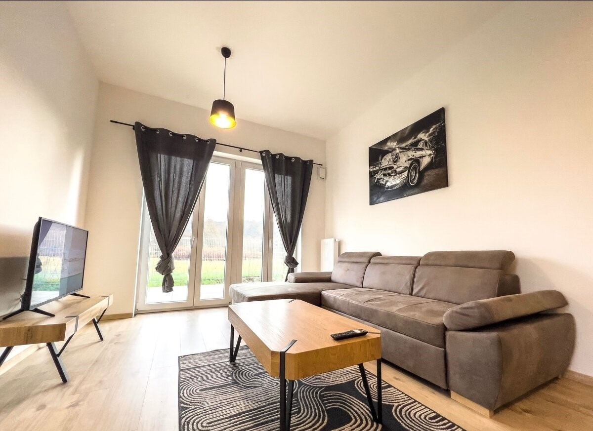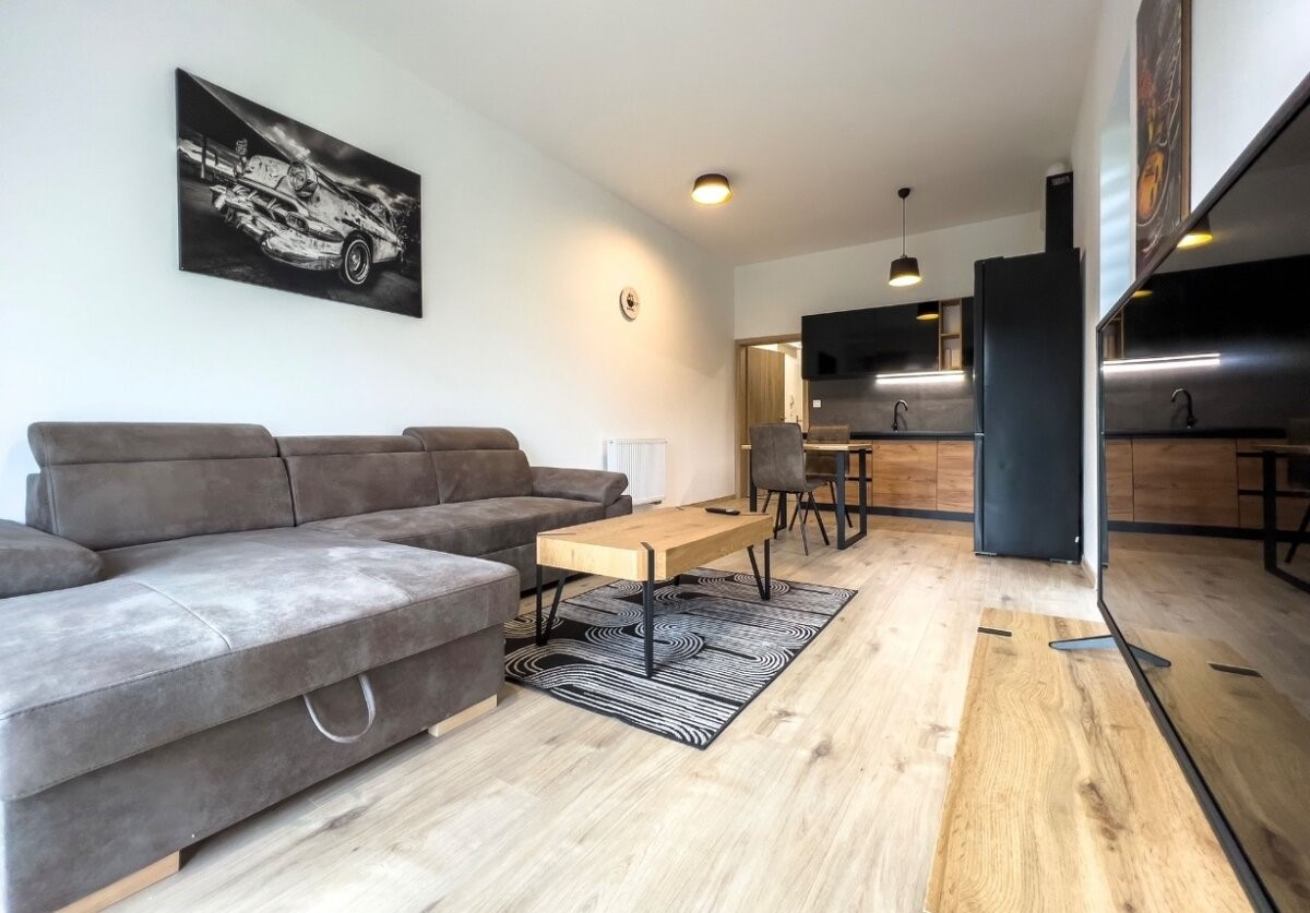 obývacia izba s pohovkou, konferenčným stolíkom, TV skrinkou a Smart TV,
