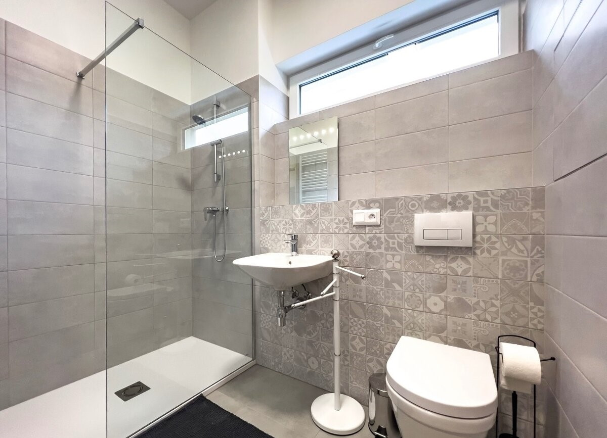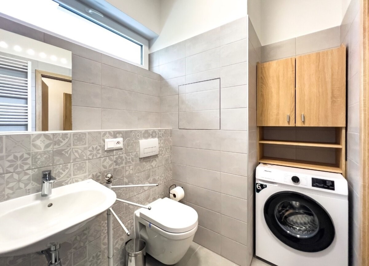 kúpeľňa so sprchovým kútom, toaletou, práčkou a skrinkami,