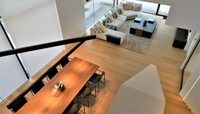Vďaka veľkoformátovým oknám, priamemu vstupu do exteriéru a orientácii na dve svetové strany je byt mimoriadne svetlý, vzdušný a poskytuje výhľad na historické centrum Bratislavy i na pokojnú zeleň vnútrobloku pri Dunaji.