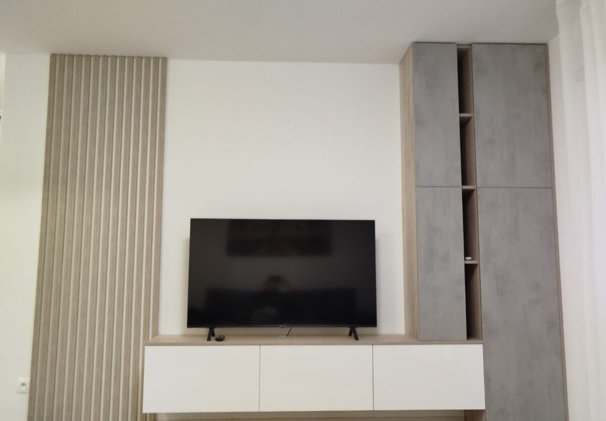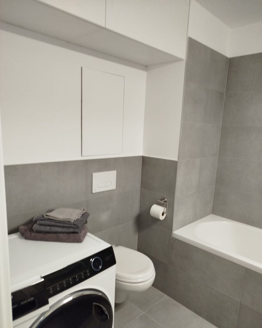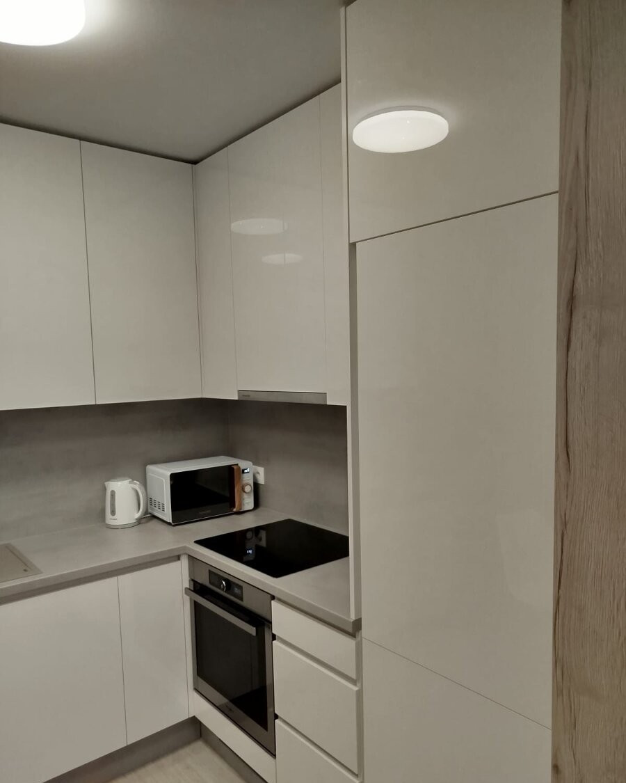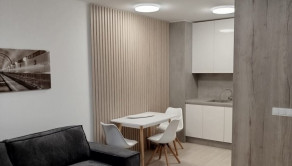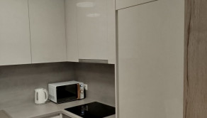 Plne vybavená moderná kuchyňa vrátane vstavaných spotrebičov (umývačky riadu, chladnička s mrazničkou, elektrickou rúrou, mikrovlnkou). V letných mesiacoch oceníte klimatizáciu. V celom byte je nábytok na mieru poskytujúci dostatok úložného priestoru.