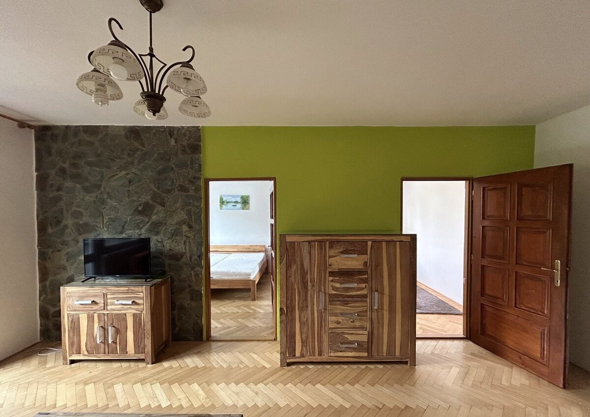 plastové okná,rolldoors,steny doplnené o moderný kamenný obklad, v obývačke a izbách parkety a v kuchyni obkladačky,v obývačke pohovka,nový nábytok,v kúpeľni vaňa,zrkadlo,regál a umývadlo,v kuchyni sú všetky spotrebiče,jedálenský stôl so stoličkami a kuchynská linka,balkón s krásnym výhladom na Zobor.