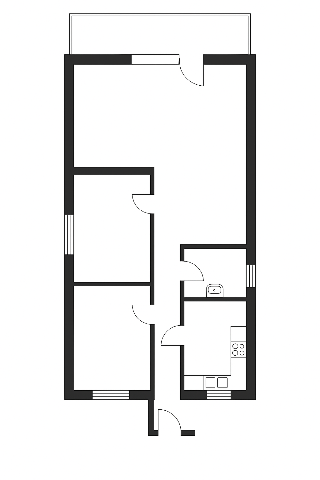 Byt má prakticky riešenú dispozíciu – po vstupe sa nachádza predsieň a chodba, z ktorej sa vstupuje do dvoch samostatných nepriechodných izieb.