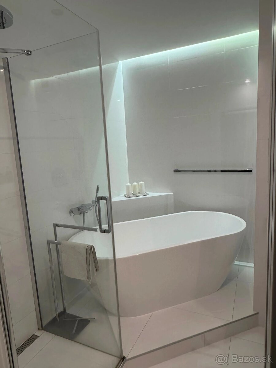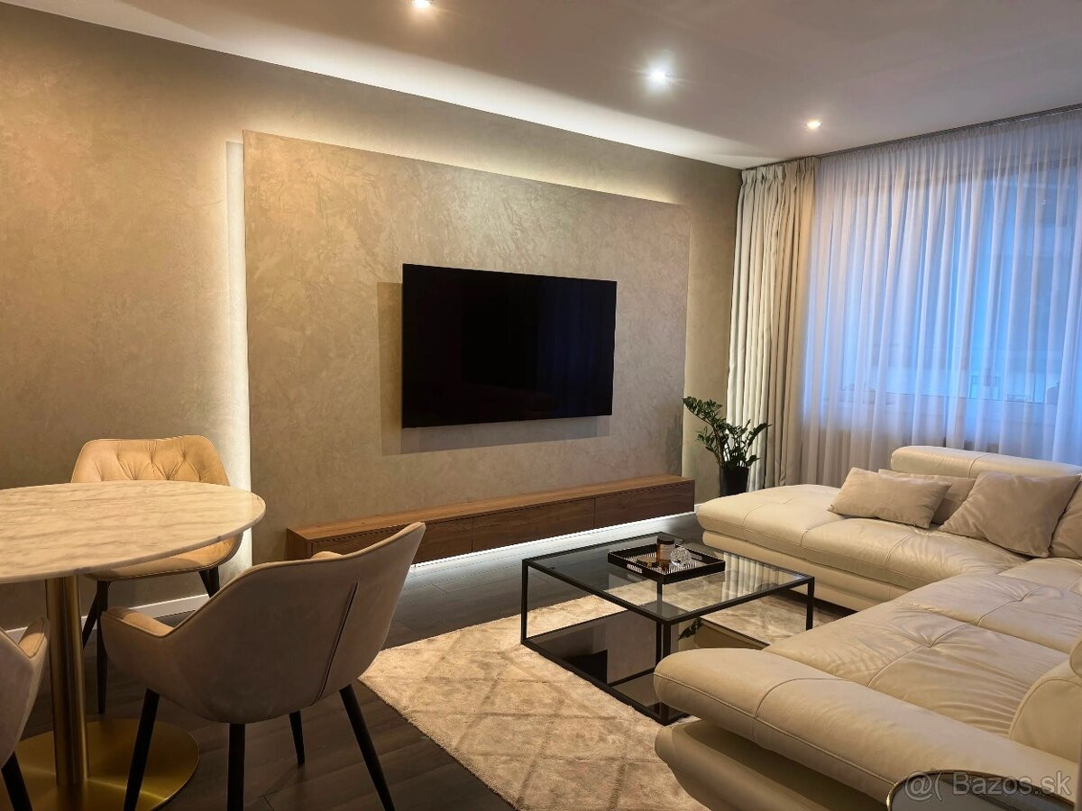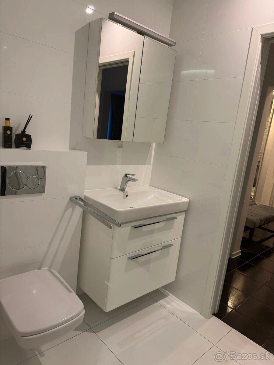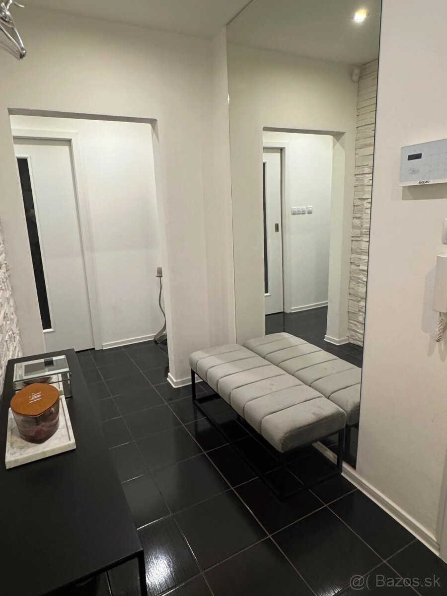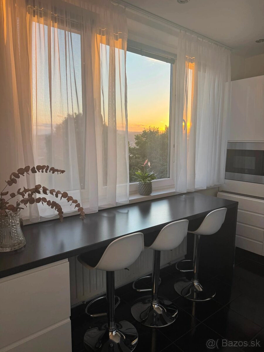 loggia s posuvným zasklenením, kvalitná kuchynská linka so zabudovanými spotrebičmi zn. Elektrolux, stôl na mieru s barovými stoličkami, obložkové zárubne s dverami, nové garniže so záclonami, omietka San Marco-Benátsky štuk, priestranné vstavané skrine v izbách). K bytu prislúcha lodžia. Bytový dom je zateplený. Nízke mesačné náklady.