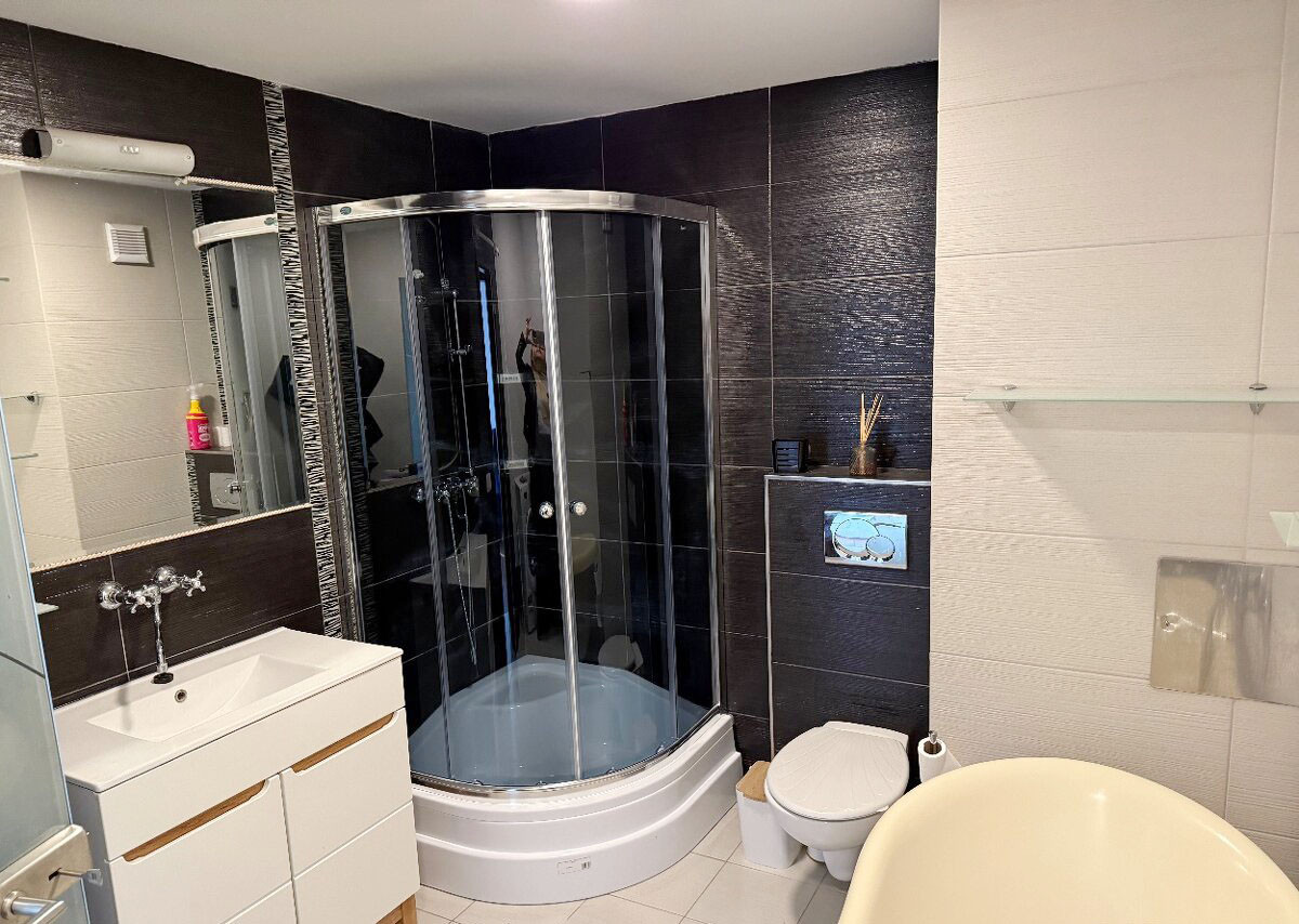 Nadštandardná kúpeľňa: Veľká, moderná kúpeľňa s vaňou aj sprchovacím kútom.