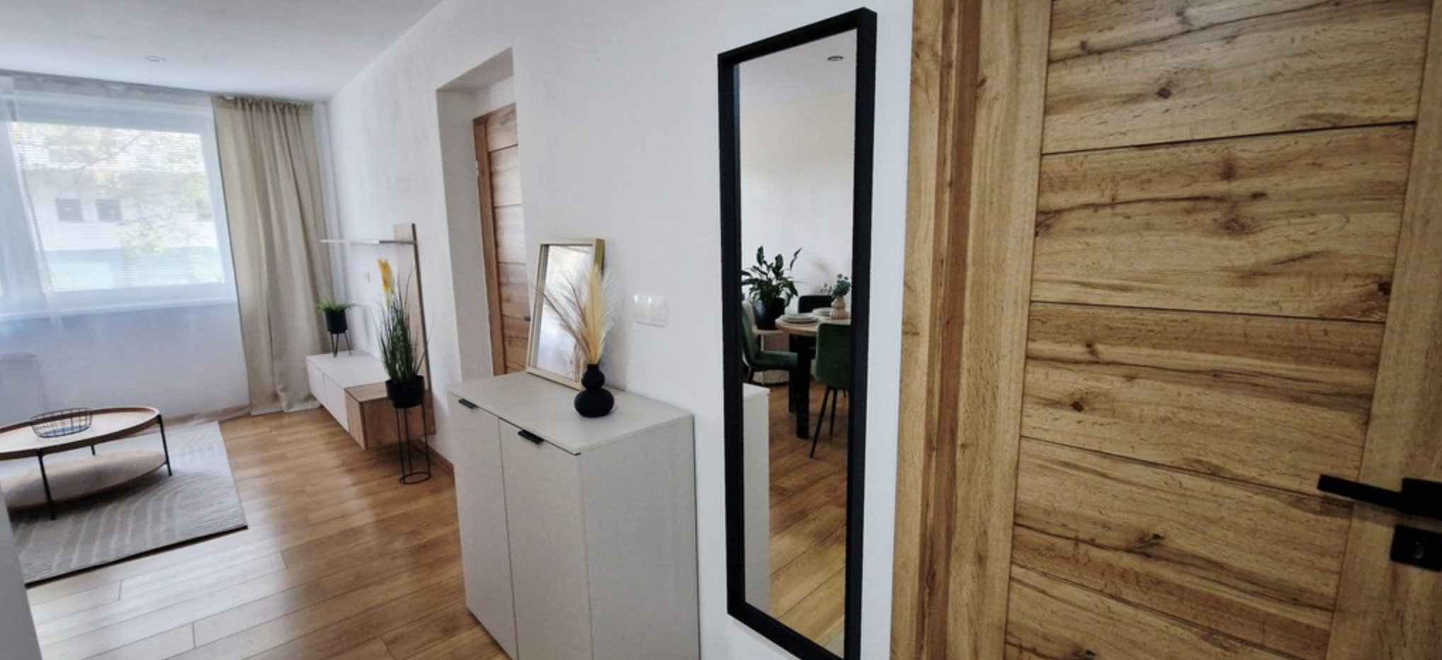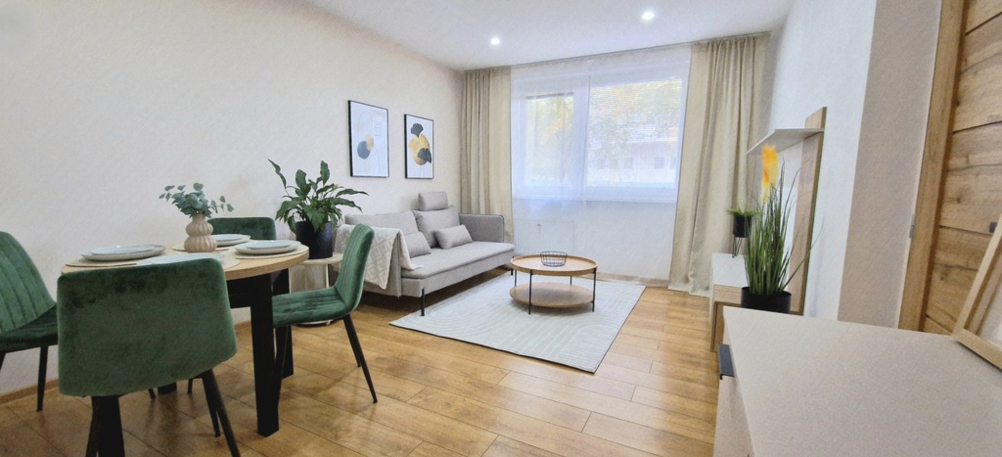zo vstupnej chodby, obývačky s jedálným stolom,kuchyňou, dvoch samostatných izieb, kúpeľne, WC a loggie.