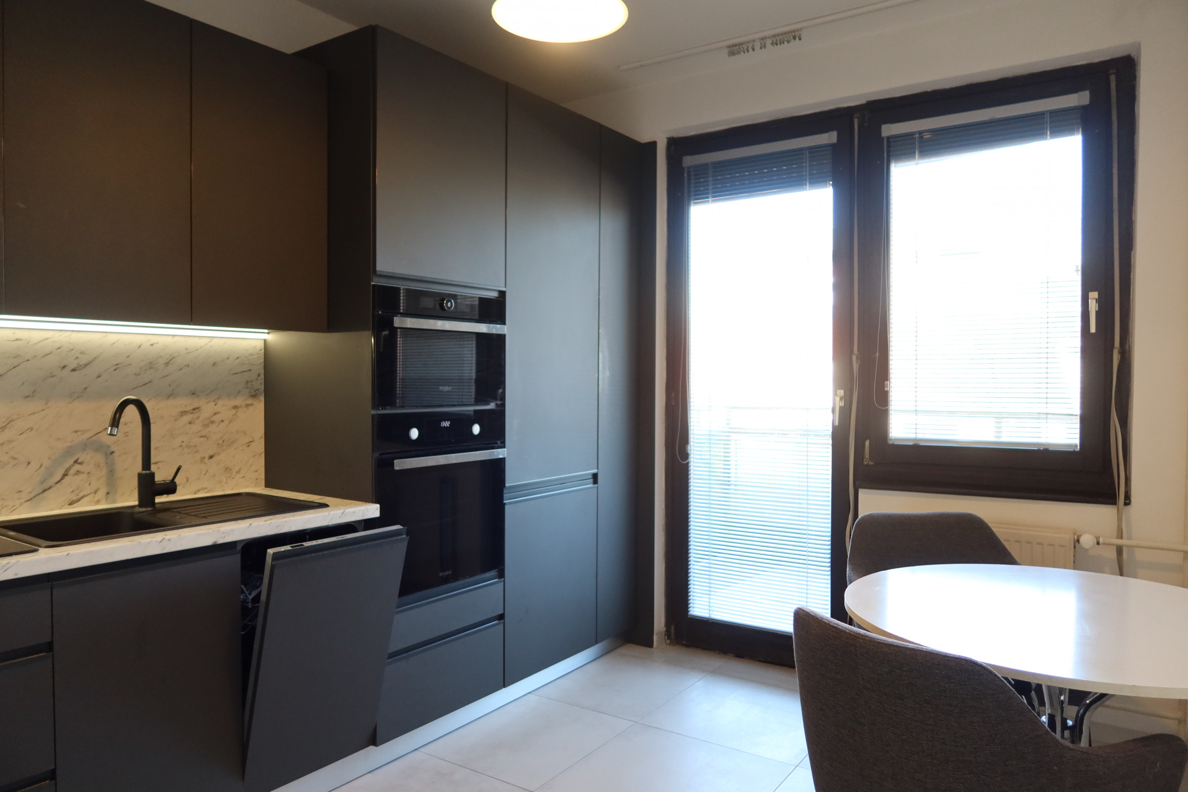 Moderná kuchyňa so vstupom na balkón a priestranná obývacia izba plná prirodzeného svetla.