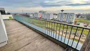 zo vstupnej chodby, obývačky s kuchyňou, dvoch samostatných izieb, kúpeľne, WC a terasa okolo celého bytu.