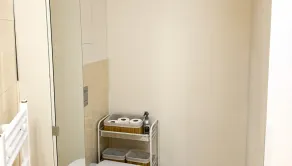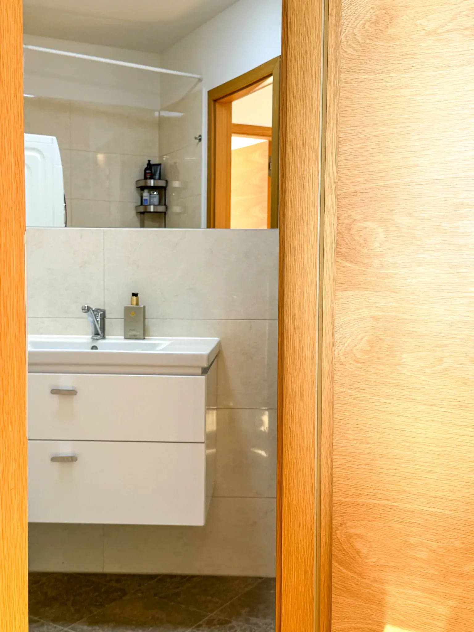 Kúpeľňa ponúka komfortnú vaňu a je prakticky vybavená aj práčkou a sušičkou, čo zvyšuje pohodlie každodenného fungovania.