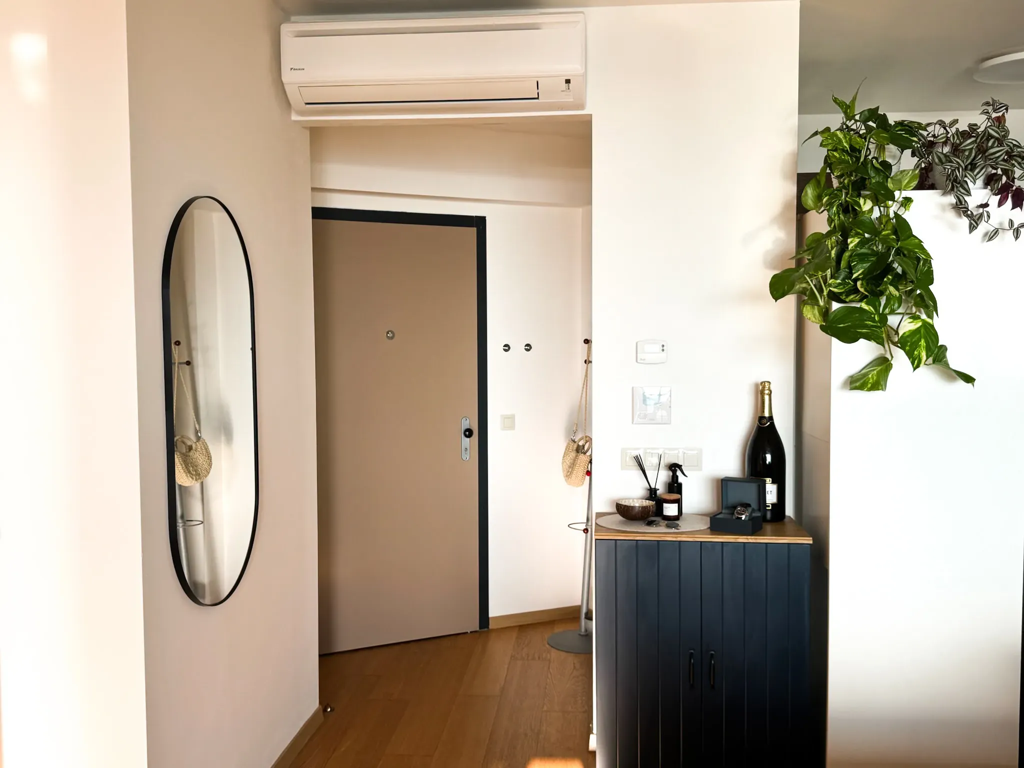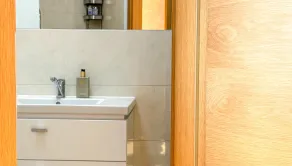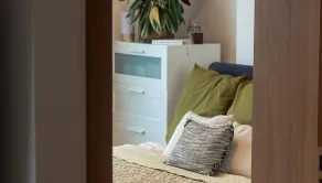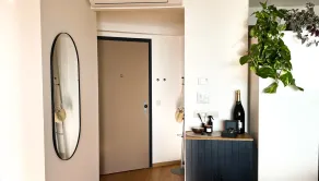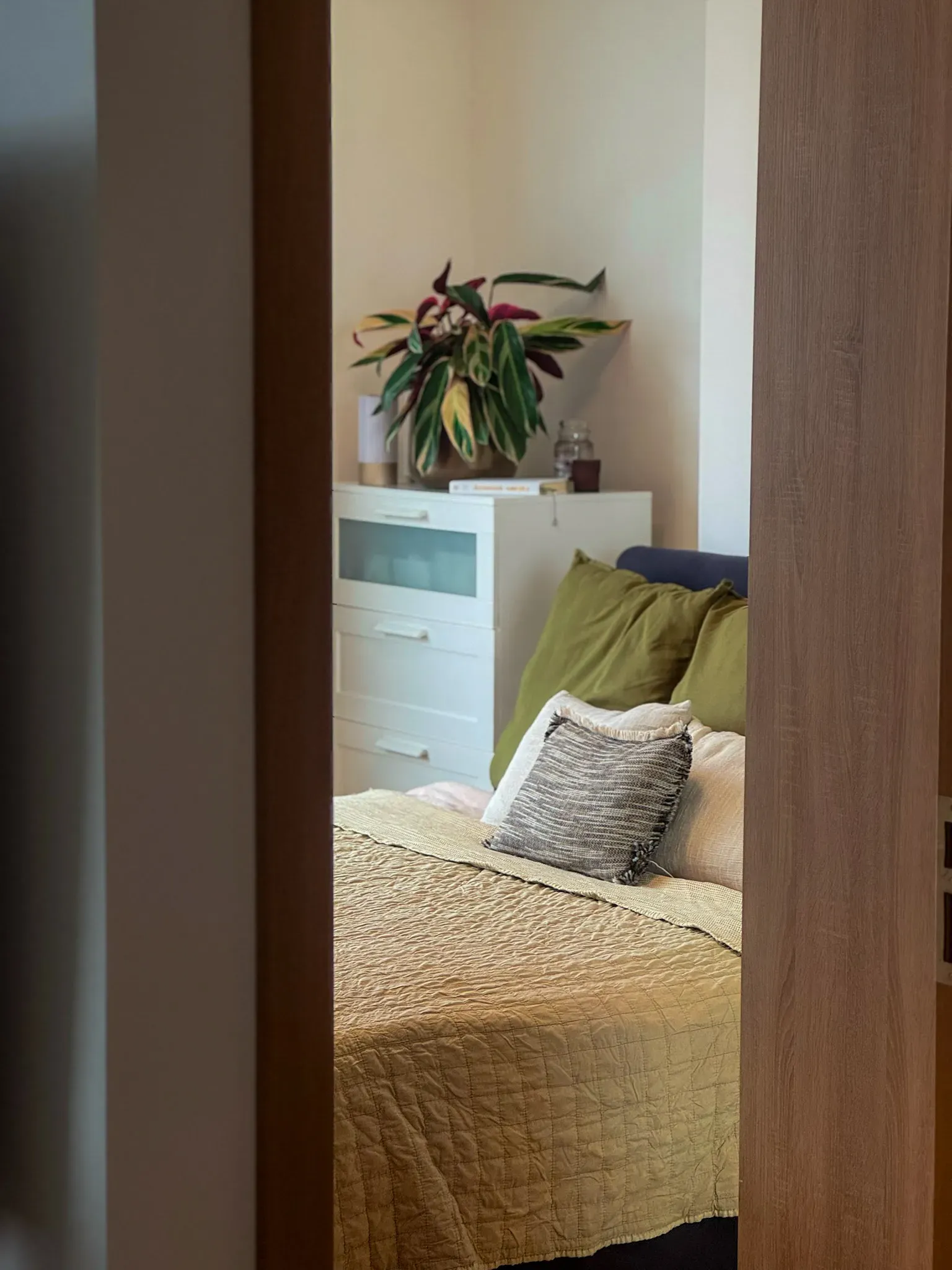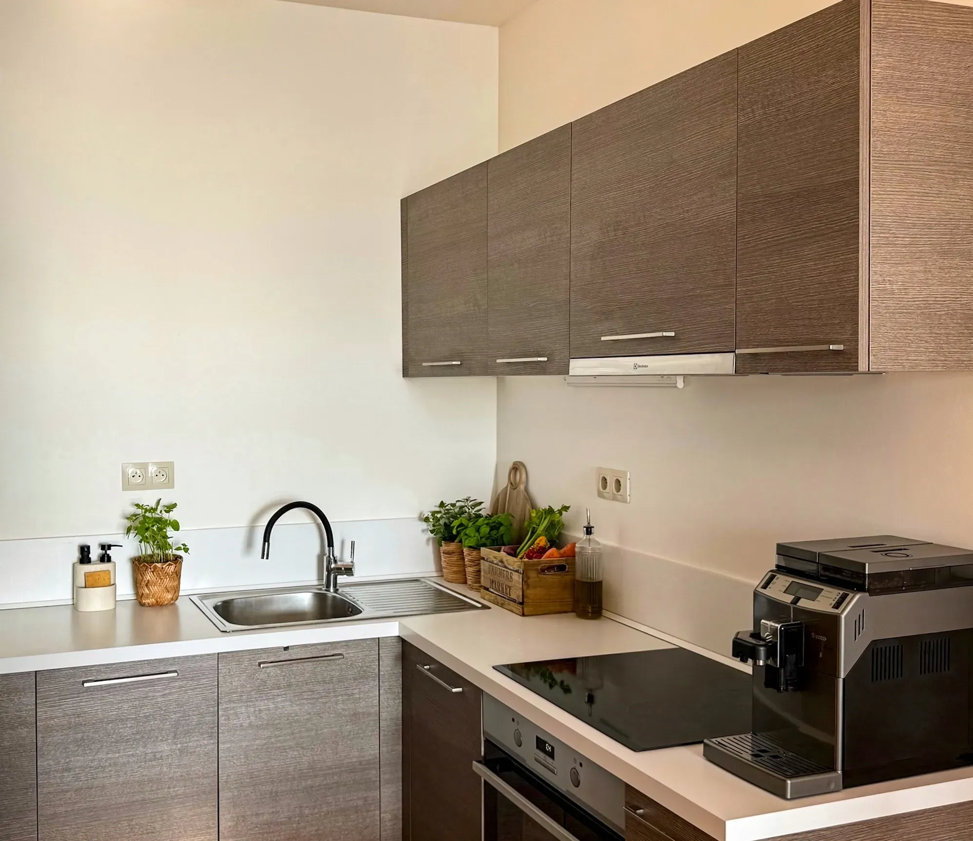Do bytu vstupujete cez vstupnú chodbu, ktorá ponúka dostatok úložného priestoru a príjemne oddeľuje vstup od dennej časti. Plynule sa z nej presúva do otvoreného obývacieho priestoru, ktorý prepája kuchyňu, obývaciu izbu a decentne integrovaný pracovný kút, ideálny pre home office. Vďaka veľkým francúzskym oknám a juhovýchodnej orientácii sem celý deň prúdi prirodzené denné svetlo, čo dodáva priestoru vzdušnosť a pocit voľnosti.