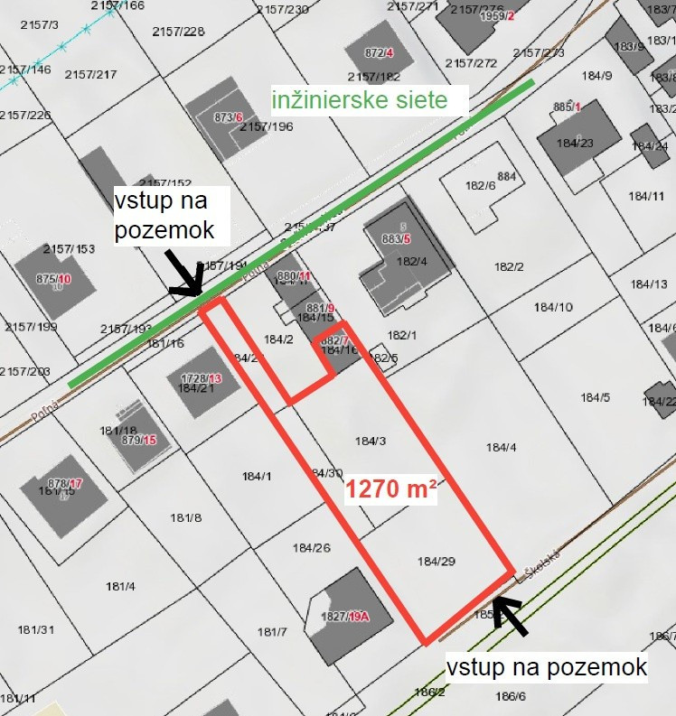 Verejné inžinierske siete - kanalizácia, vodovod, rozvod NN a plyn sú priamo pred pozemkom. K pozemku vedie asfaltová prístupová cesta. Na pozemku sa nachádza menší starý dom.
