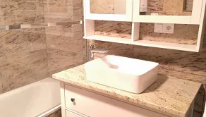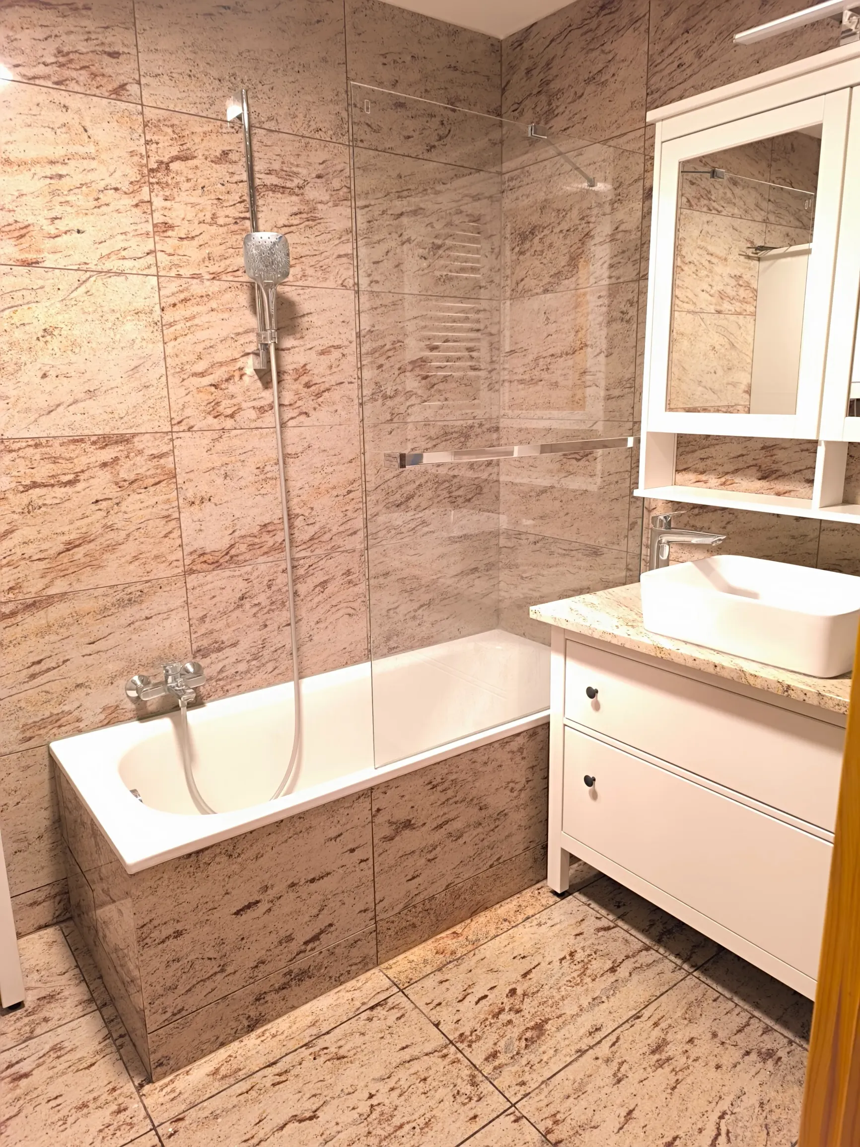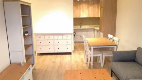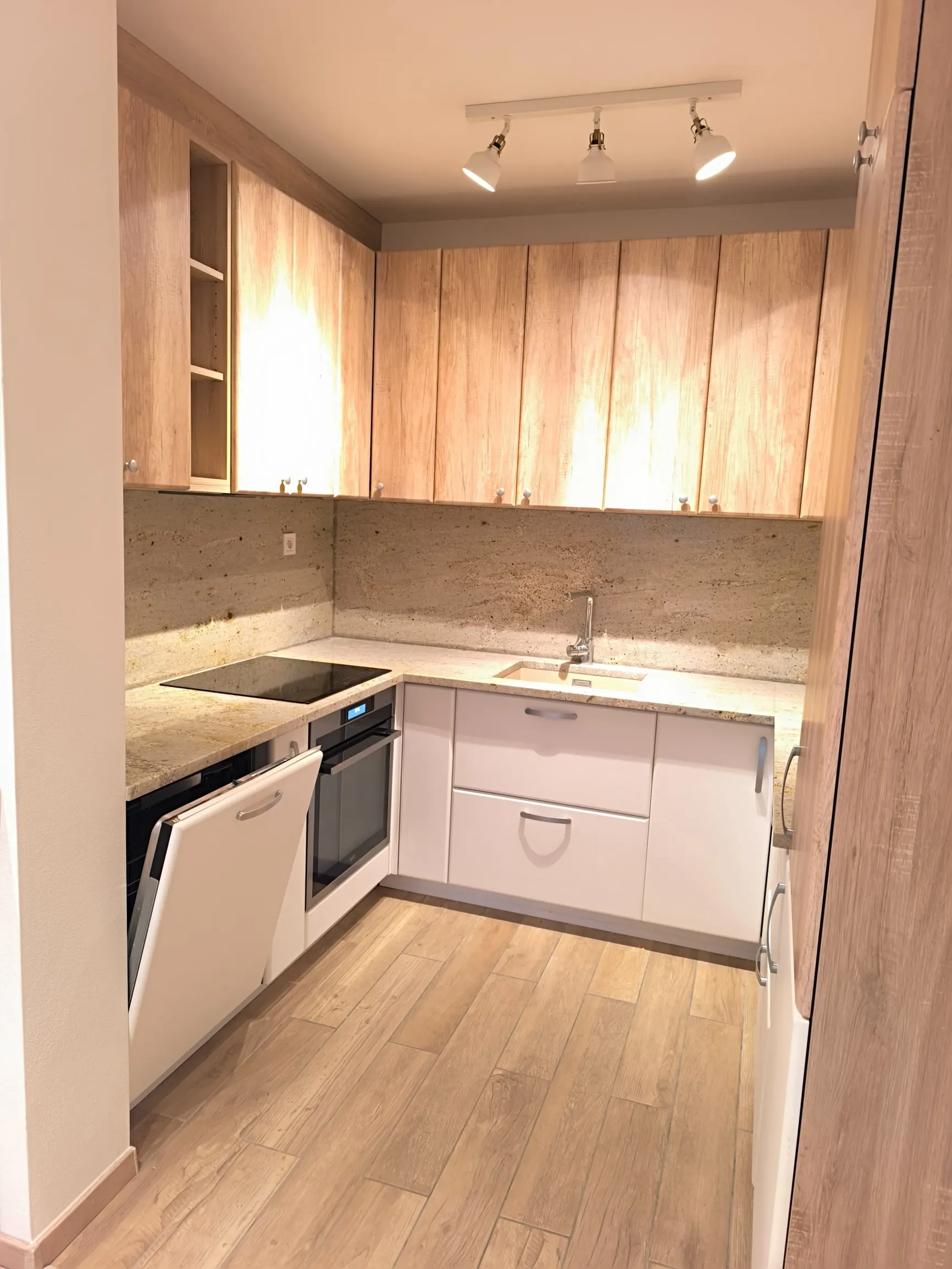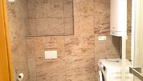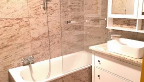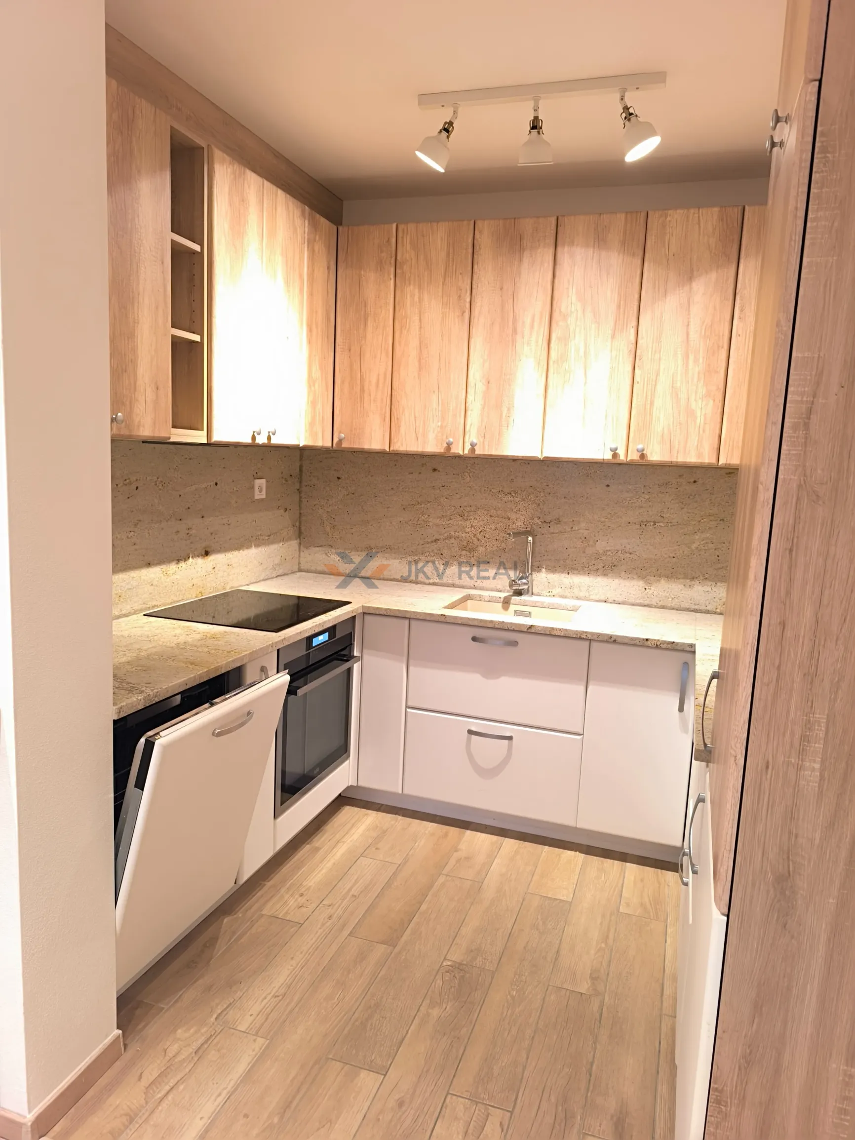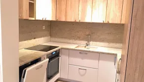 Byt je takmer nový, obývaný bol iba jedným nájomníkom. Je kompletne zariadený a pri jeho vybavení boli použité kvalitné, luxusné prírodné materiály – drevo a kameň, čo je viditeľné aj na fotografiách.