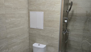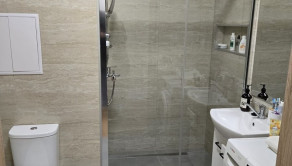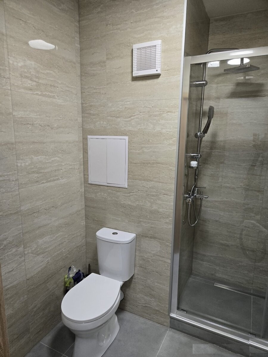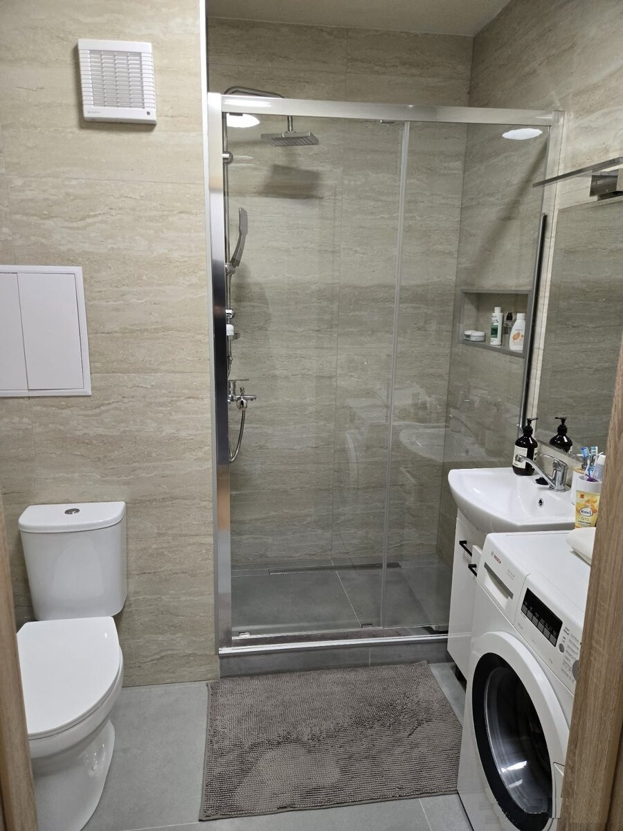 krásne prerobená kúpeľňa so sprchovacím kútom a WC