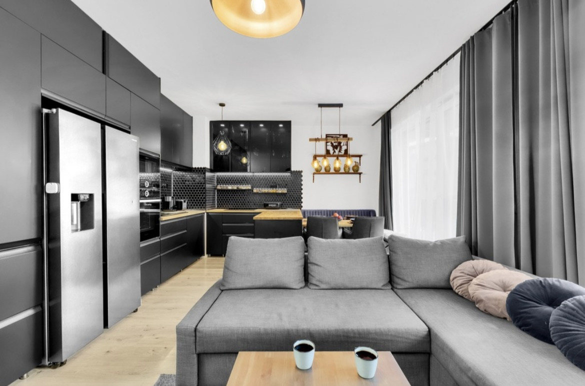 - veľkorysá obývacia izba elegantne prepojená s kuchynskou časťou