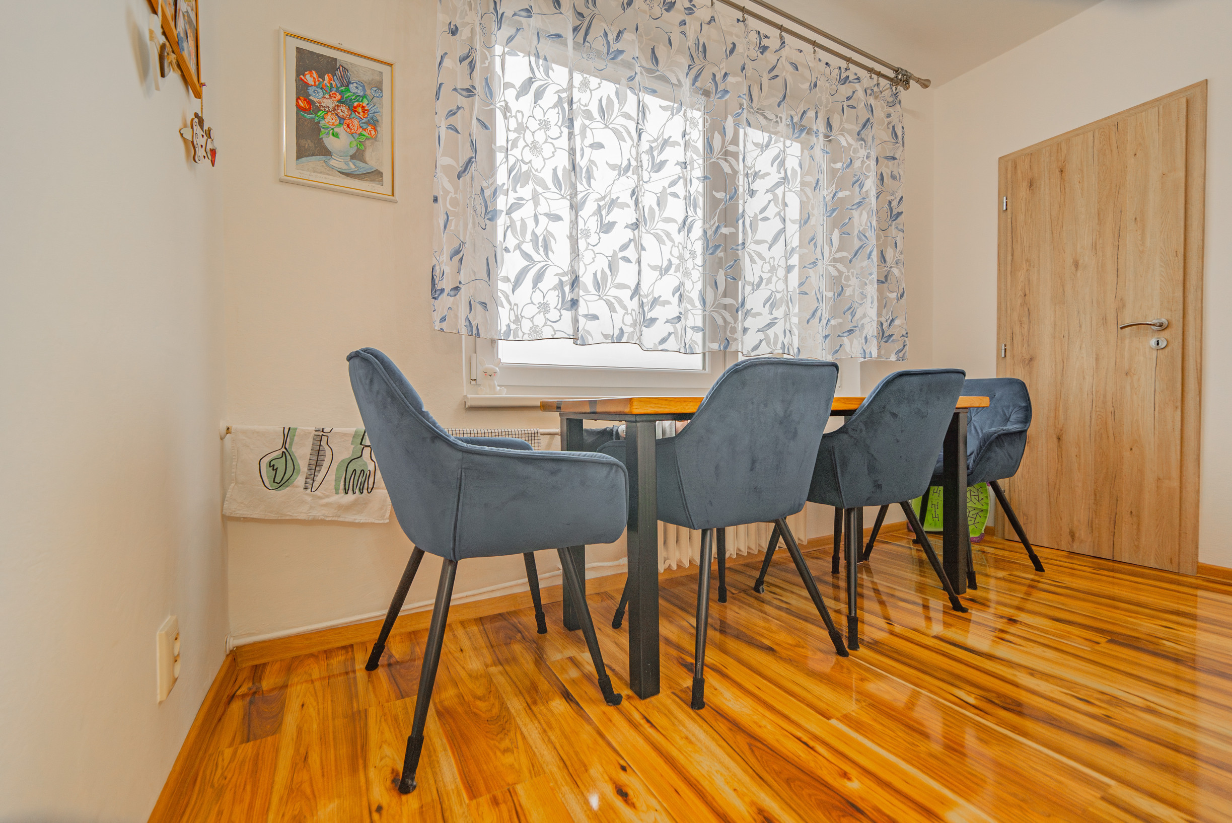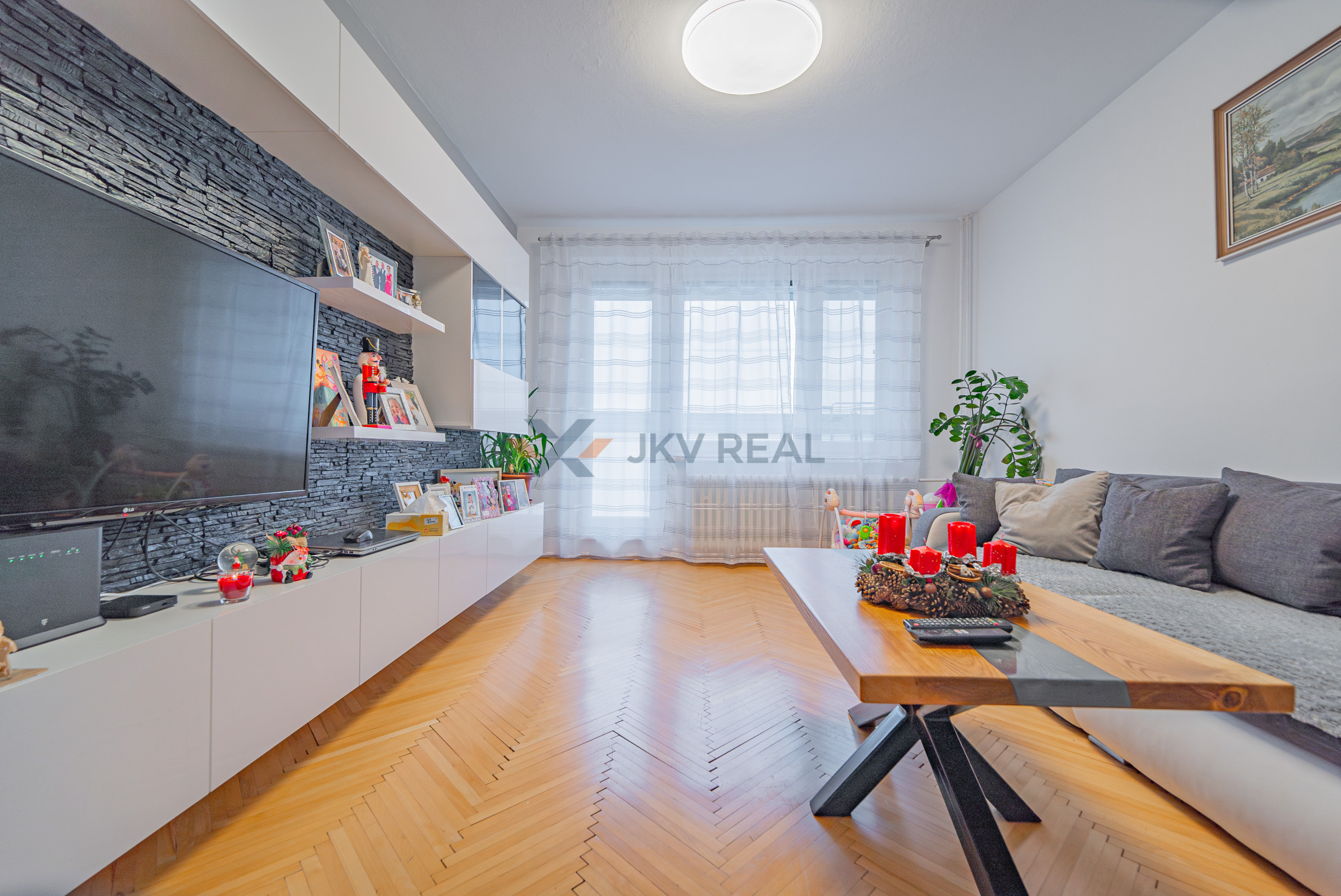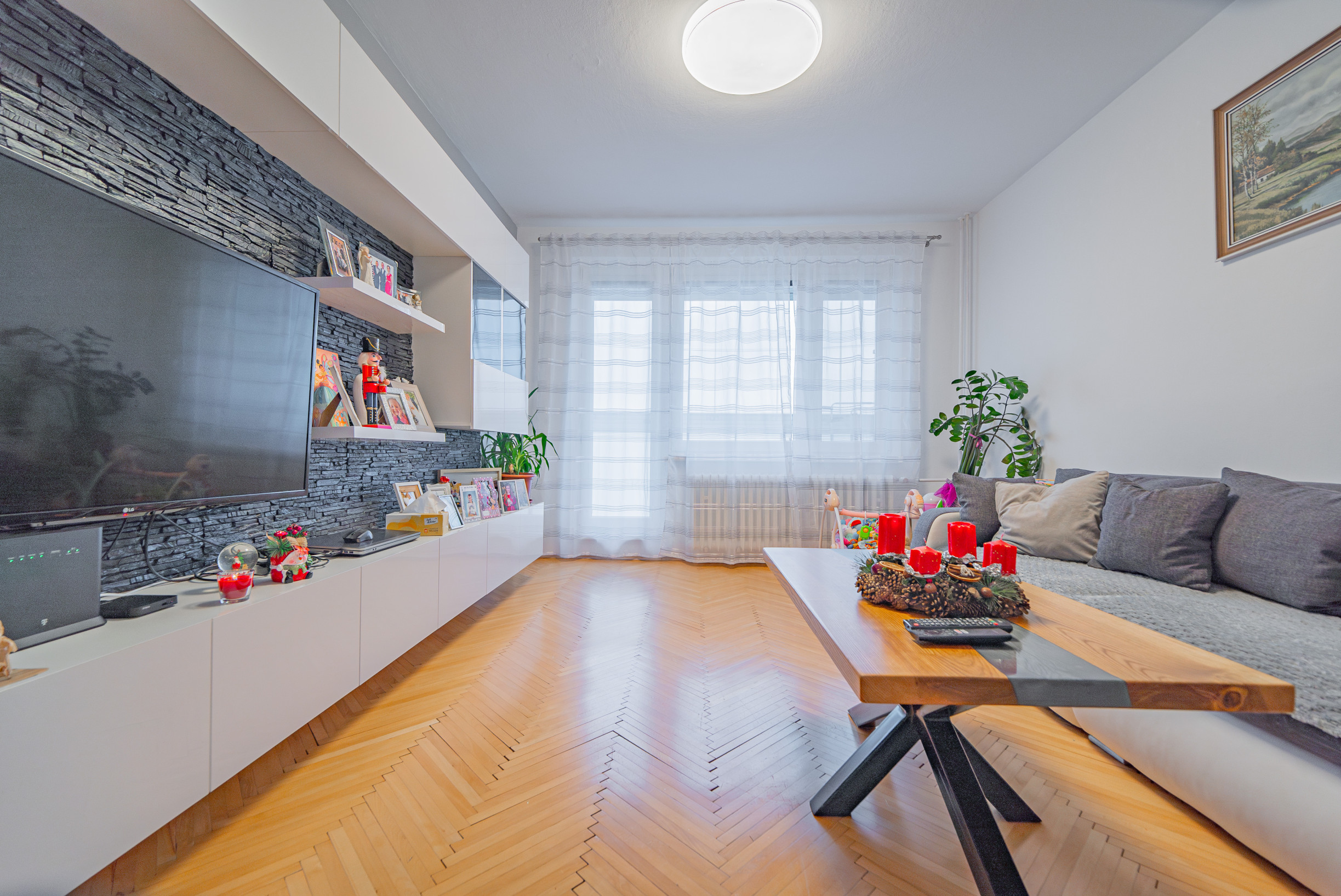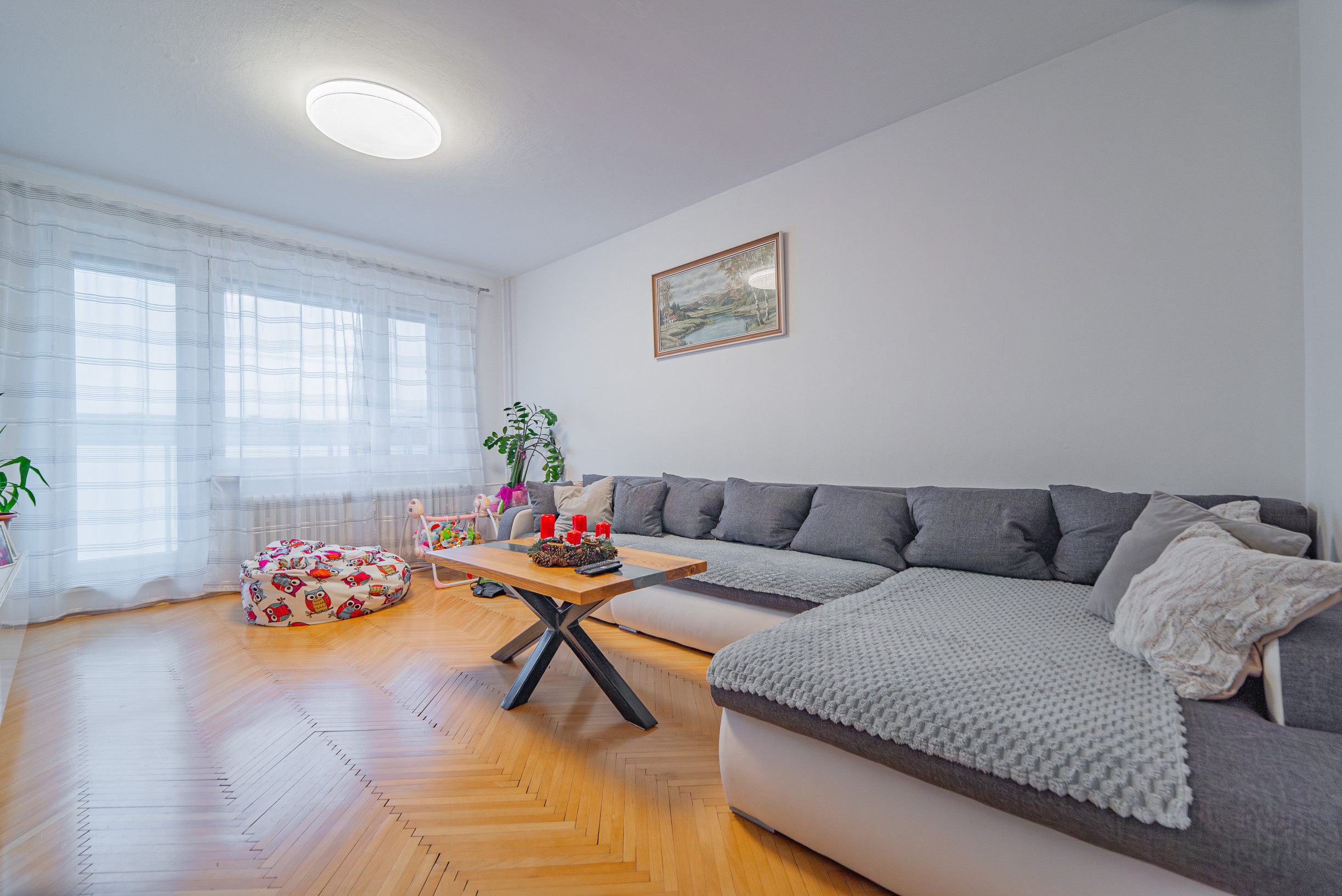 -slnečná obývacia izba s parketami v krásnom stave a so vstupom na zasklennú loggiu