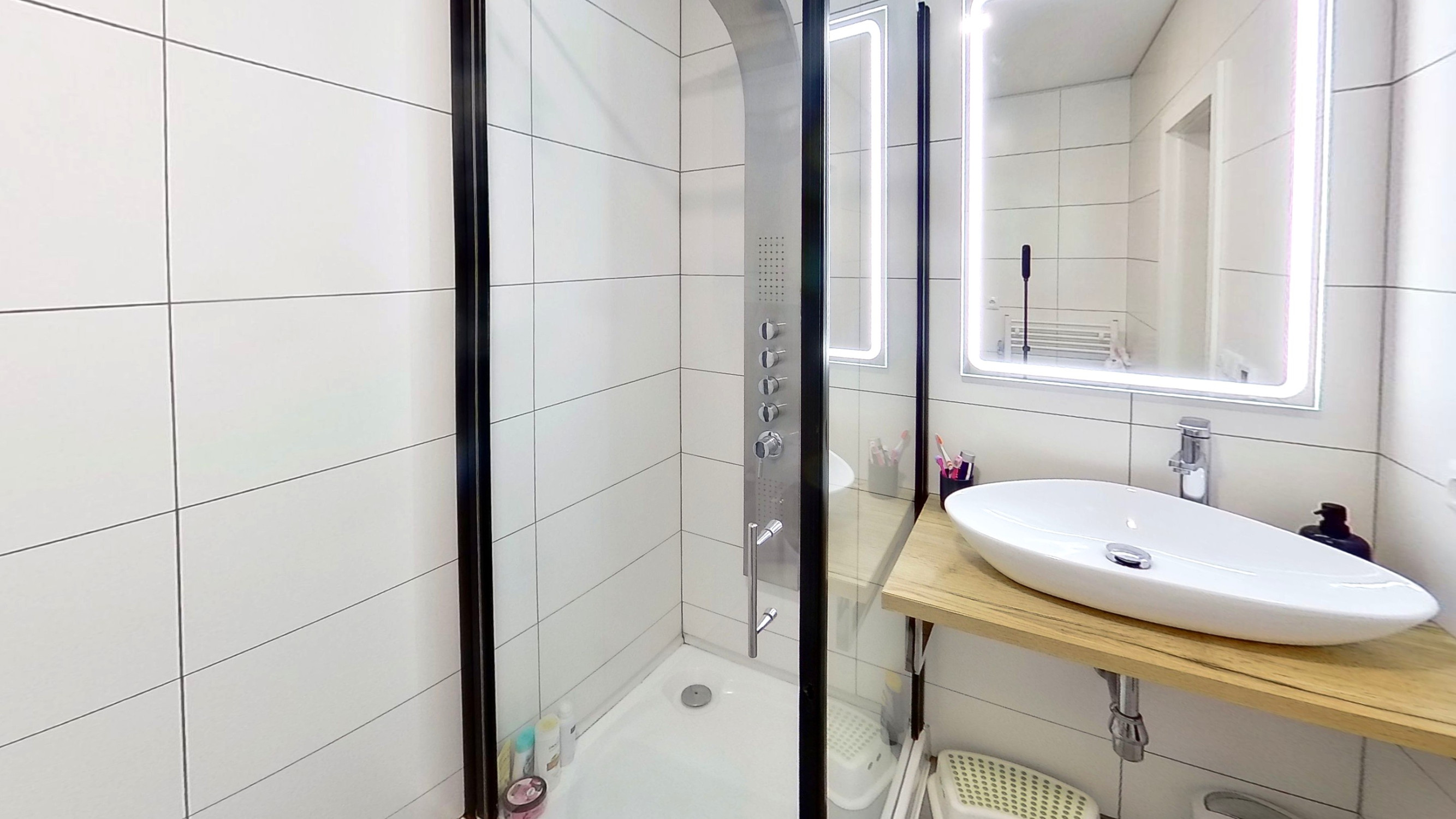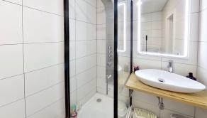 - Kúpeľňa so sprchovým kútom, umývadlom, skrinkami na mieru, práčkou,