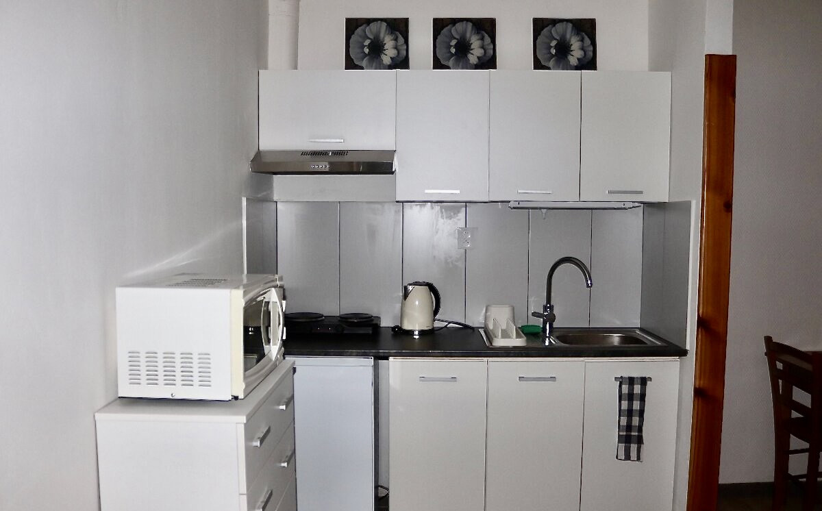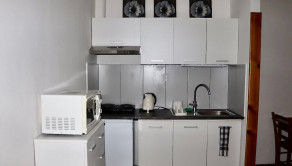 kuchynská linka, mikrovlnná rúra, chladnička, jedálensky stôl, manželská posteľ, TV a ostatný nábytok.