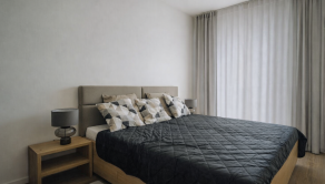 - Spálňa minimalisticky zariadená – manželská posteľ a bohatý vstavaný uložný nábytok