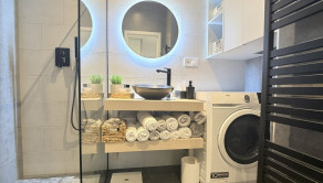 - Moderná kúpeľňa vybavená sprchovým kútom, umývadlom a práčkou so sušičkou
