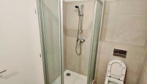 kúpeľňa so sprchovacím kútom spojená s toaletou