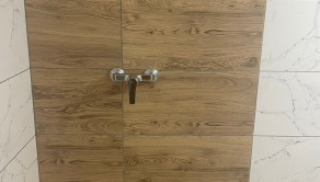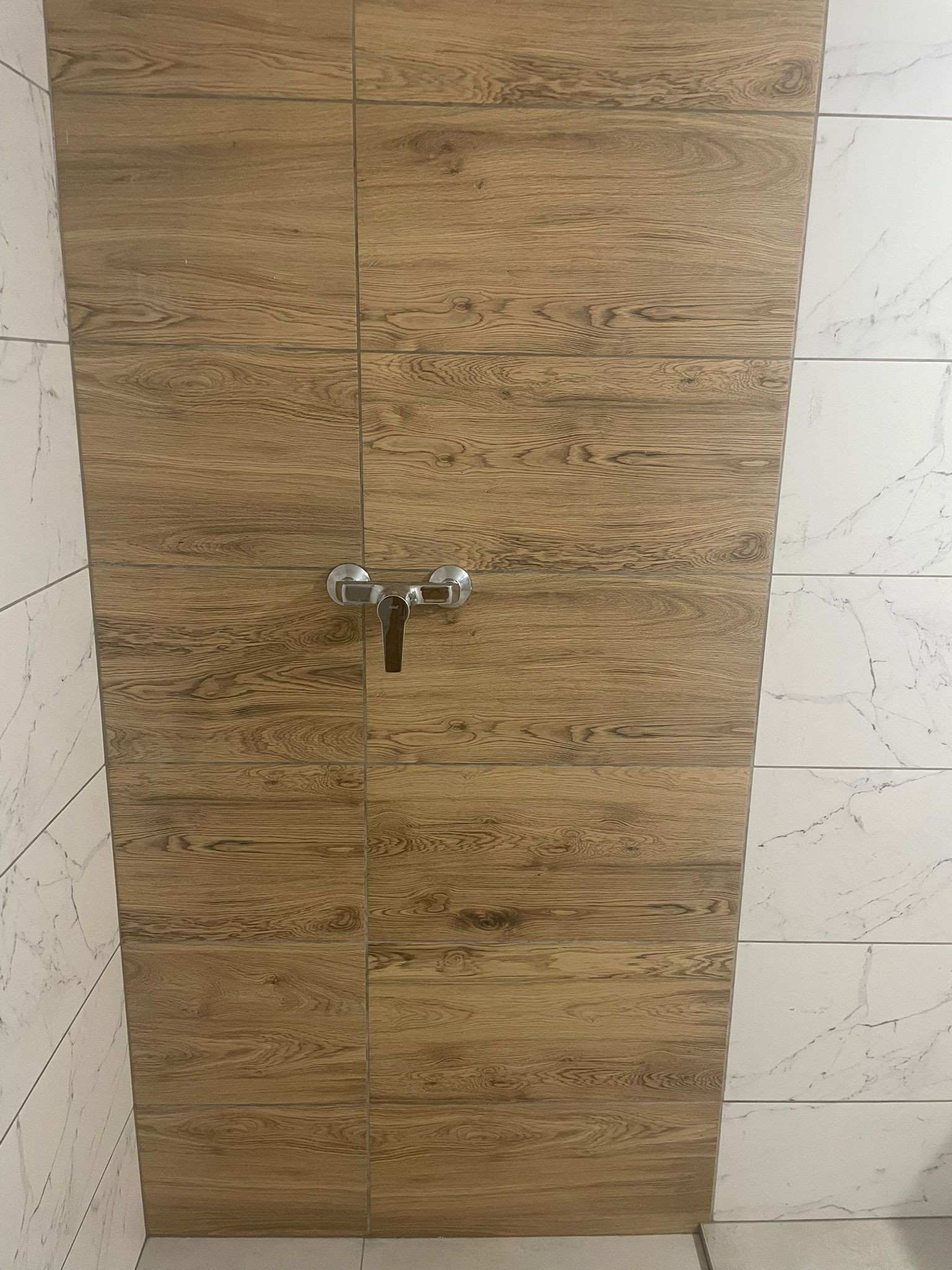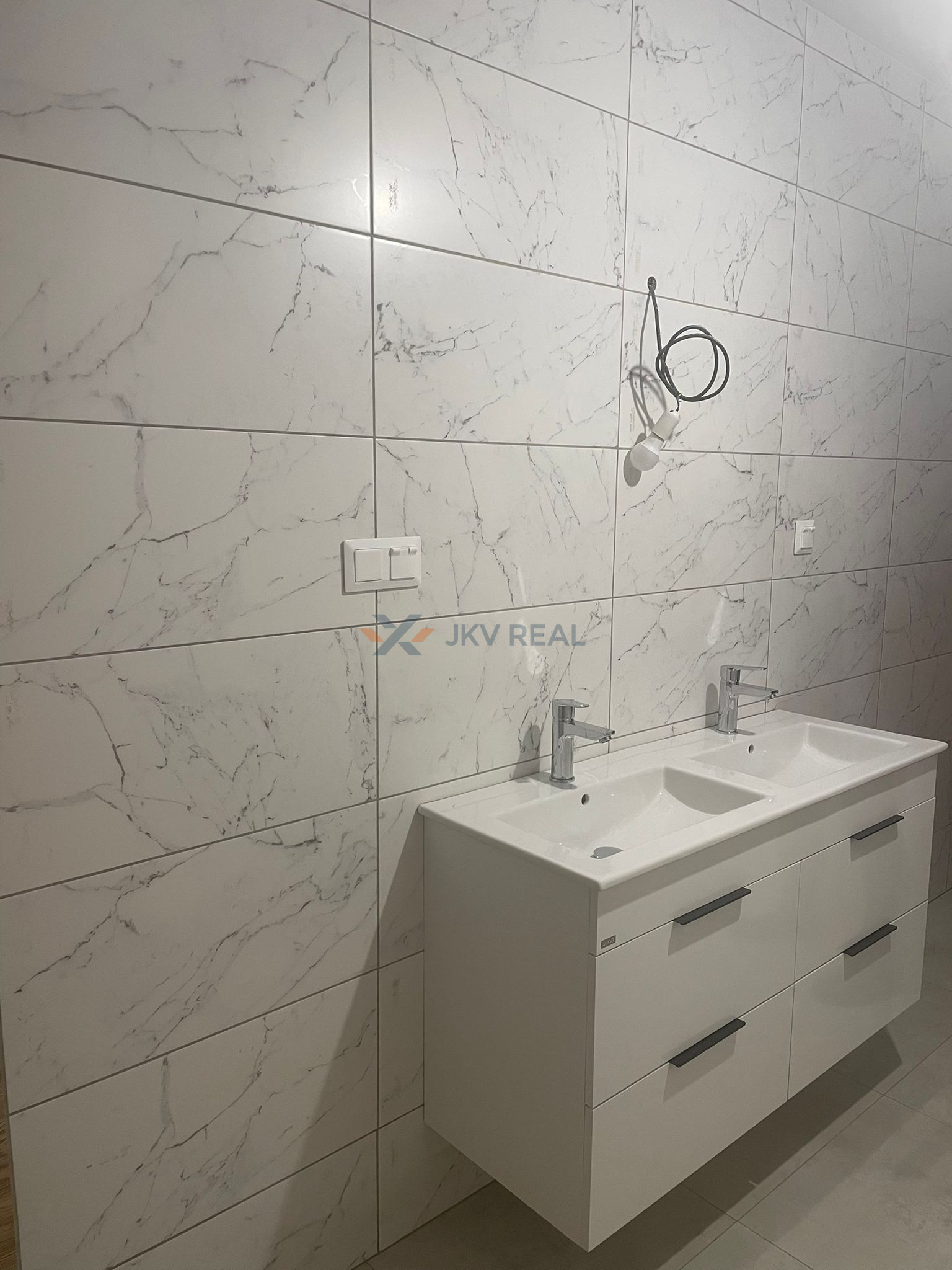 K dispozícii je aj samostatná technická miestnosť s priestorom na práčku a sušičku, aby kúpeľňa zostala čistá a vzdušná. Kúpeľňa očarí kombináciou dreva, kameňa a moderných prvkov, ktoré vytvárajú pocit domáceho wellness.