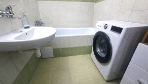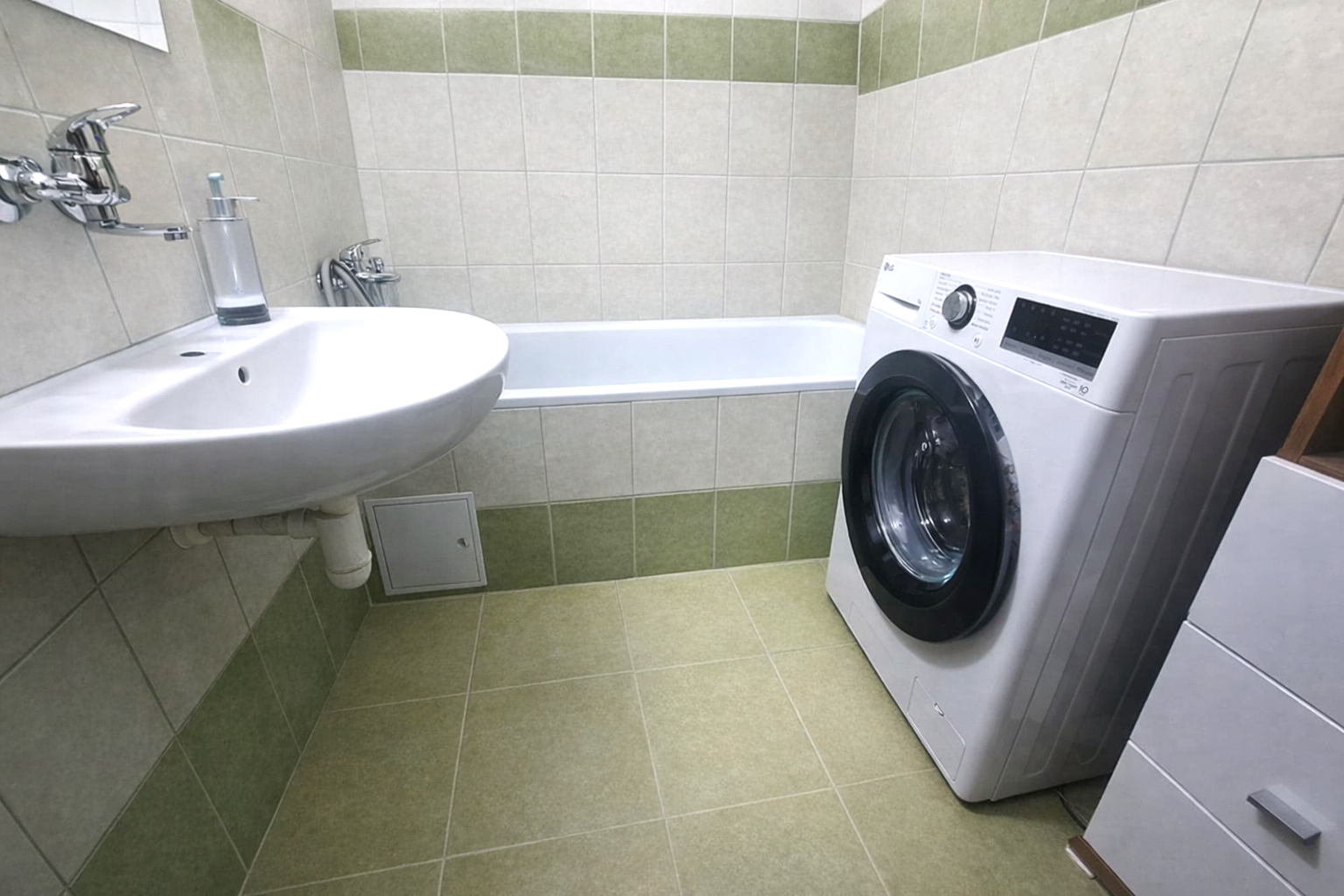 Kúpeľňa s vaňou, práčkou a úložným priestorom.