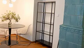 The apartment’s most striking feature is the high ceilings and original preserved ceramic stoves, creating a unique atmosphere of elegant First Republic living.