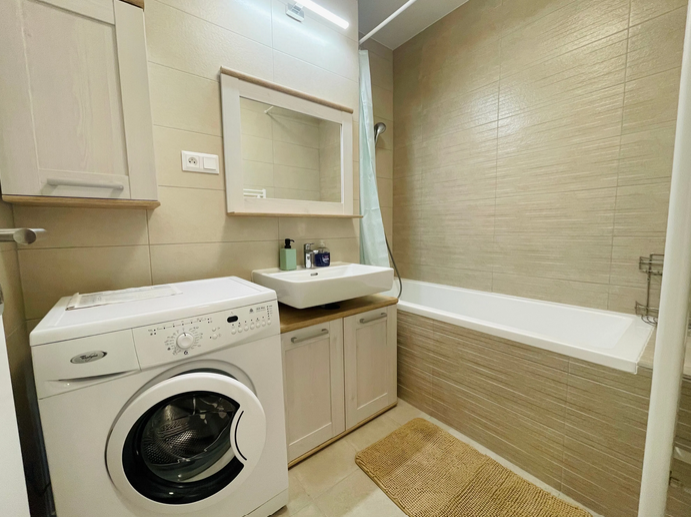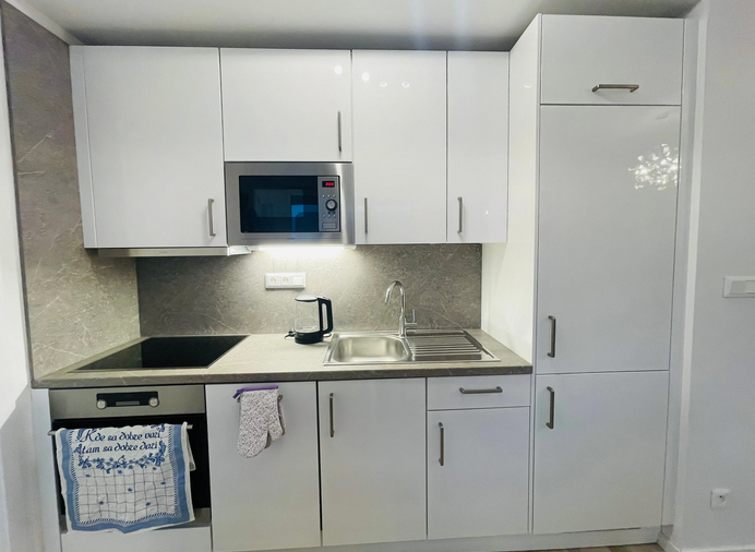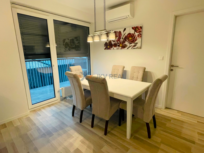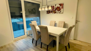 kompletne zariadený (práčka, umývačka riadu, varná doska, rúra, chladnička s mrazničkou, TV, dva výduchy klimatizácie a externé žalúzie.