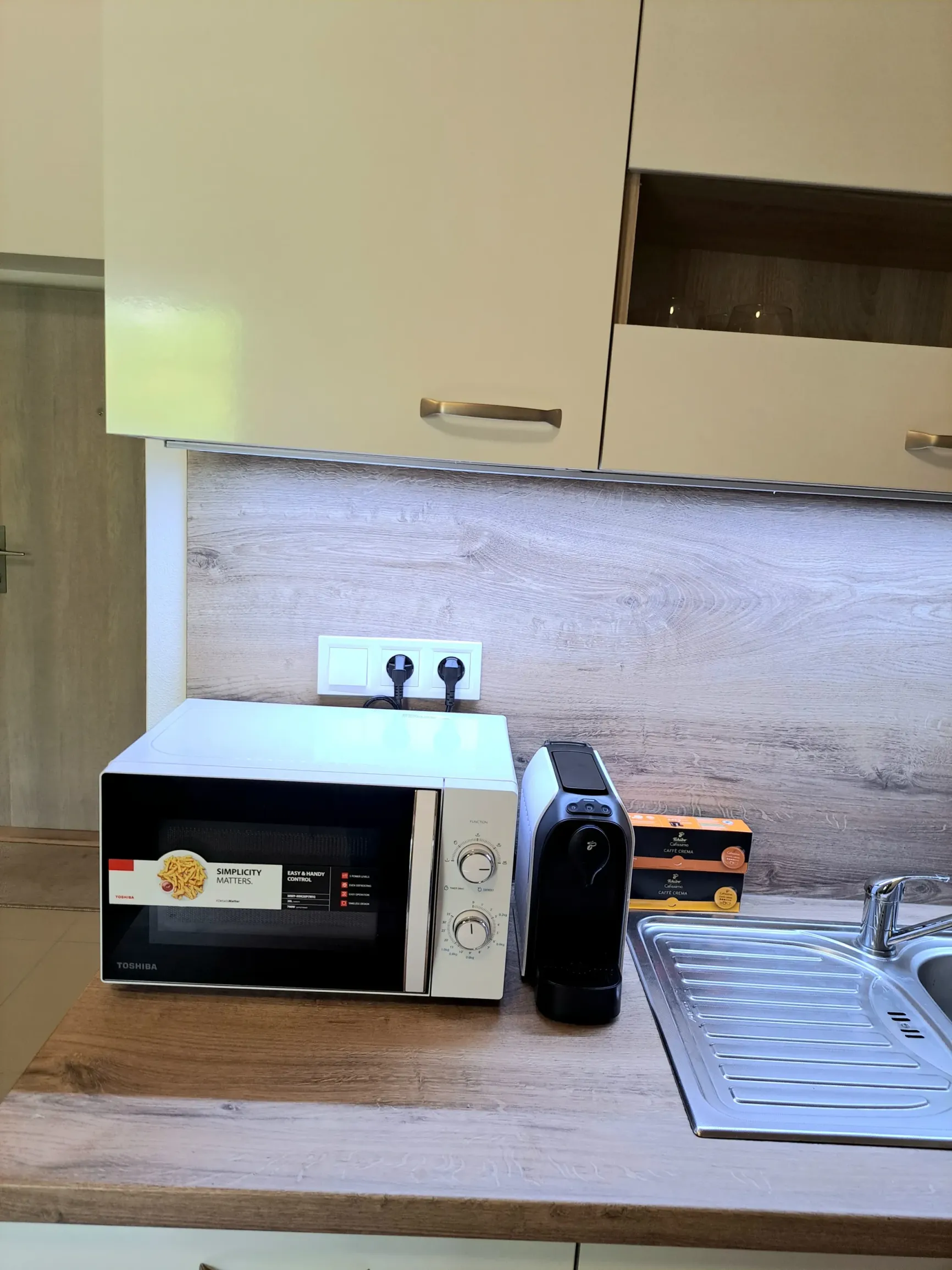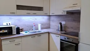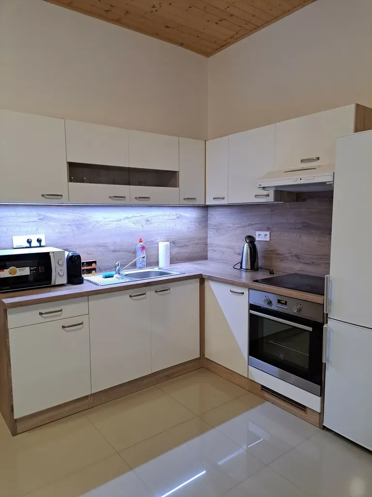 - kúpeľňa (sprchový kút, toaleta, práčka) - kuchyňa (chladnička s mrazníčkou, elektrický sporák a rúra, mikrovlnka, kávovar) - jedálenská časť: jedálenský stôl, stoličky - obývacia časť: sedačka, konferenčný stolík, TV skrinka, TV