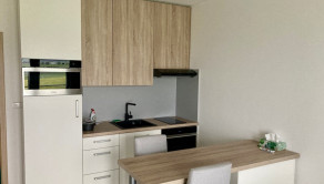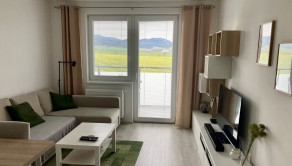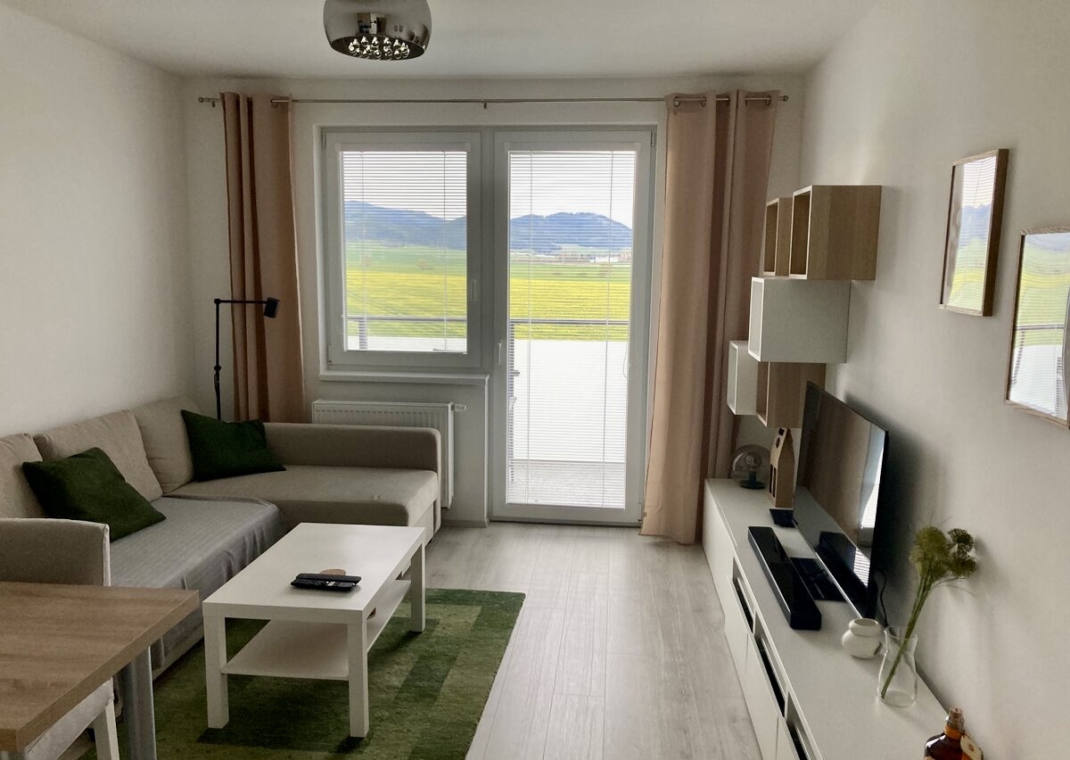 Plne zariadený – stačí si priniesť osobné veci a môžete bývať (moderná kuchynská linka so spotrebičmi, gauč, stôl, obývačkova stena – všetko ako na fotkách)