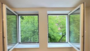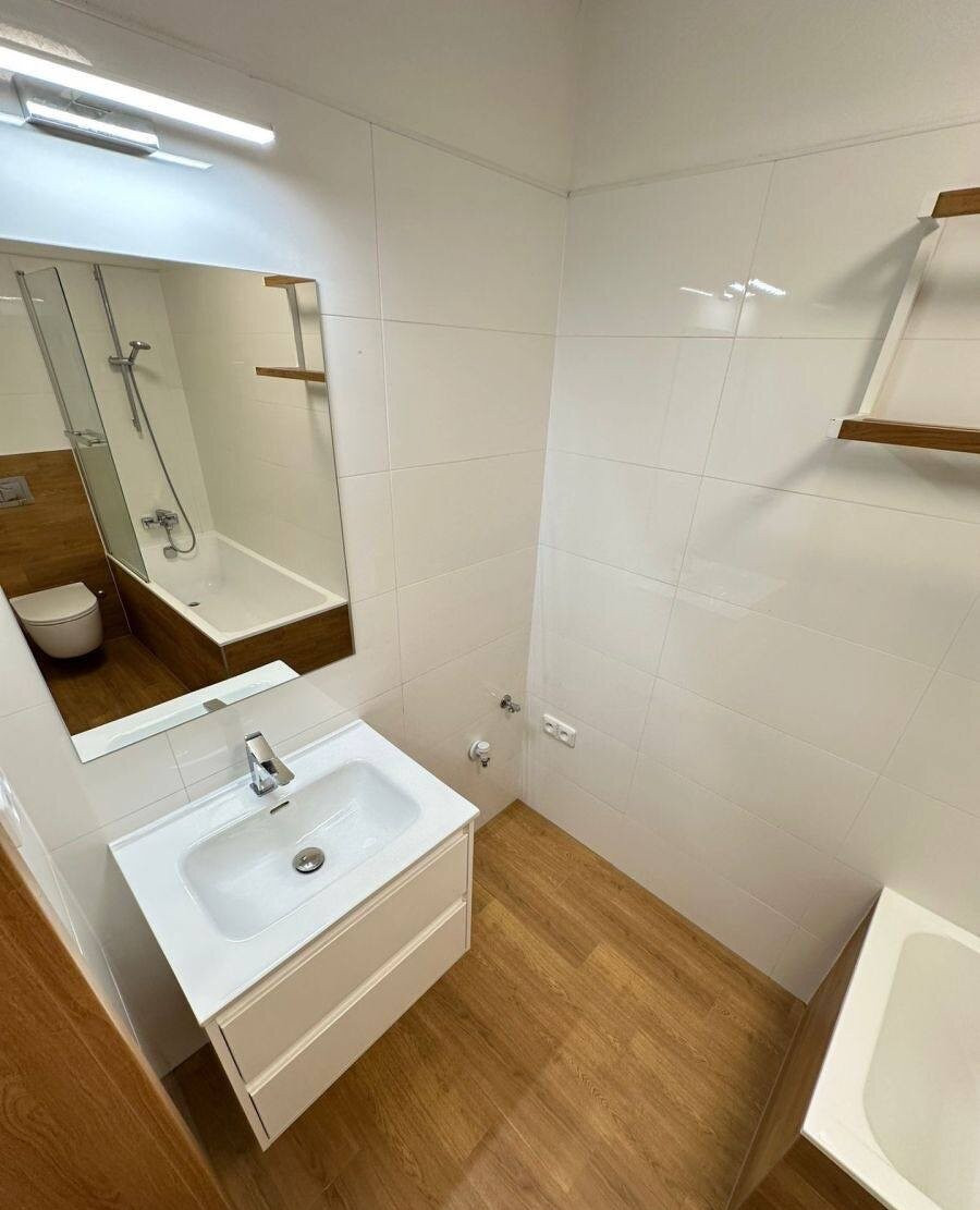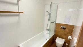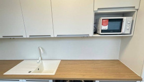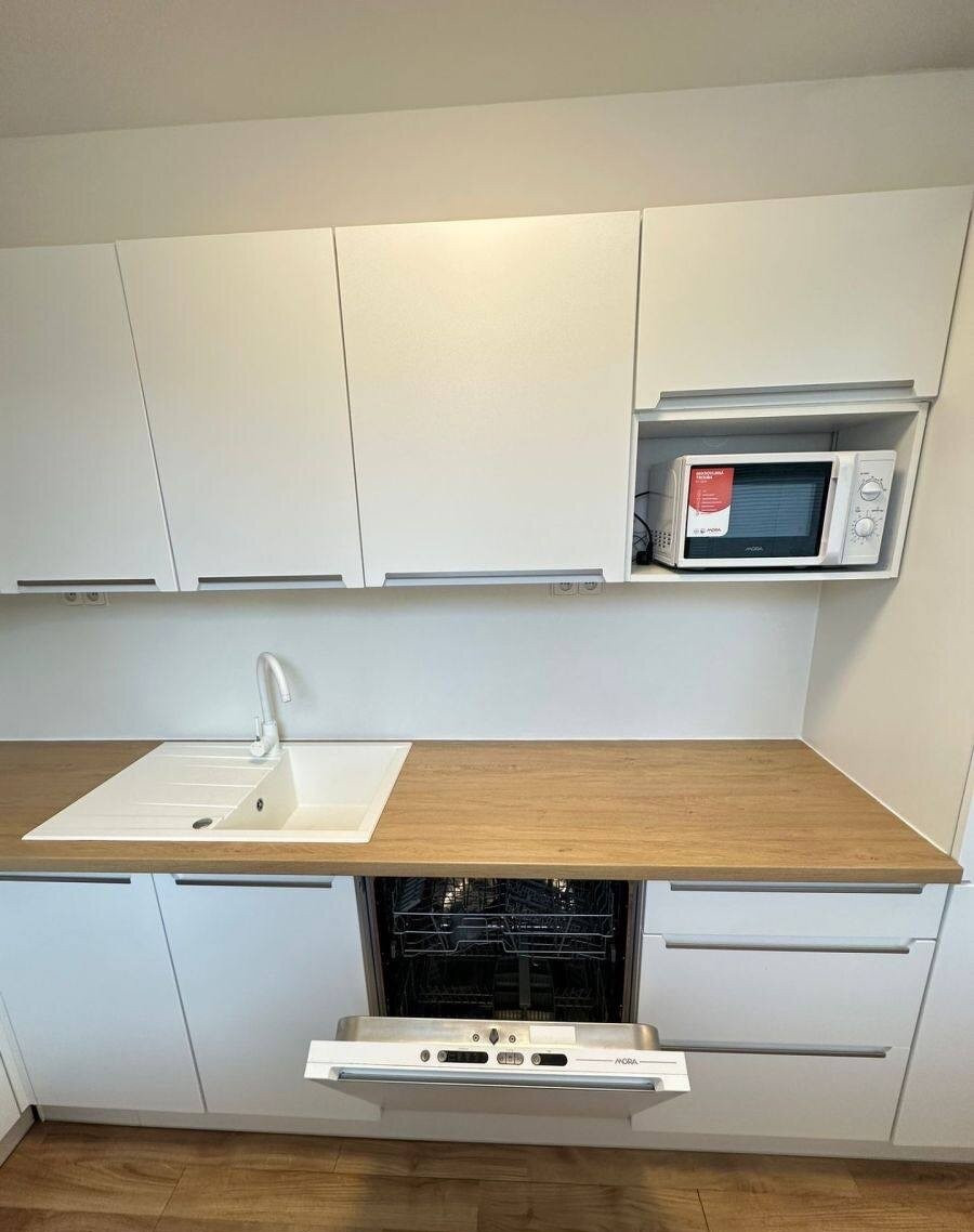 plastové okná, plávajúca podlaha, v kúpeľni dlažba, vaňa, umývadlo, kuchynská linka, spotrebiče (chladnička, sporák, mikrovlnná rúra